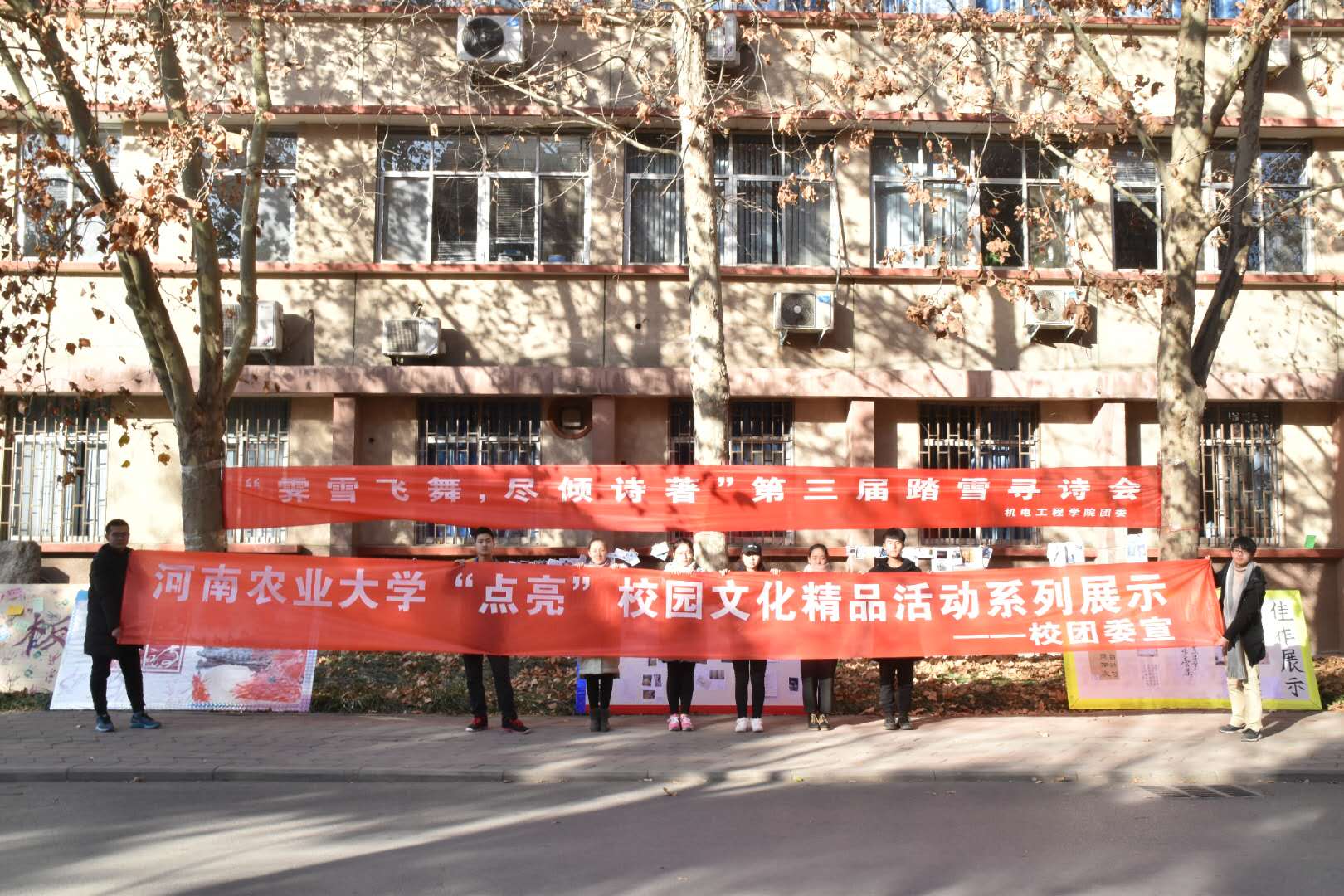 于12月16日下午,在15号楼前举行了“点亮”校园文化精品活动之“圆梦工场”——“霁雪昼舞,尽倾诗著”踏雪寻诗会。