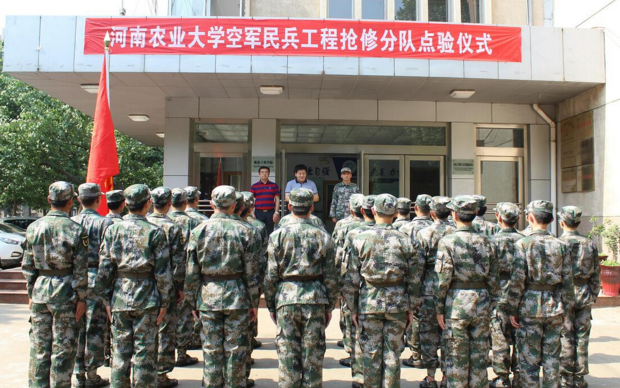 于15号楼前举行空军民兵工程抢修分队点验大会。金水区武装部政委李继东、校学生工作部部长、武装部部长李书民、我党委副书记刘海涛出席了此次仪式,成人影院