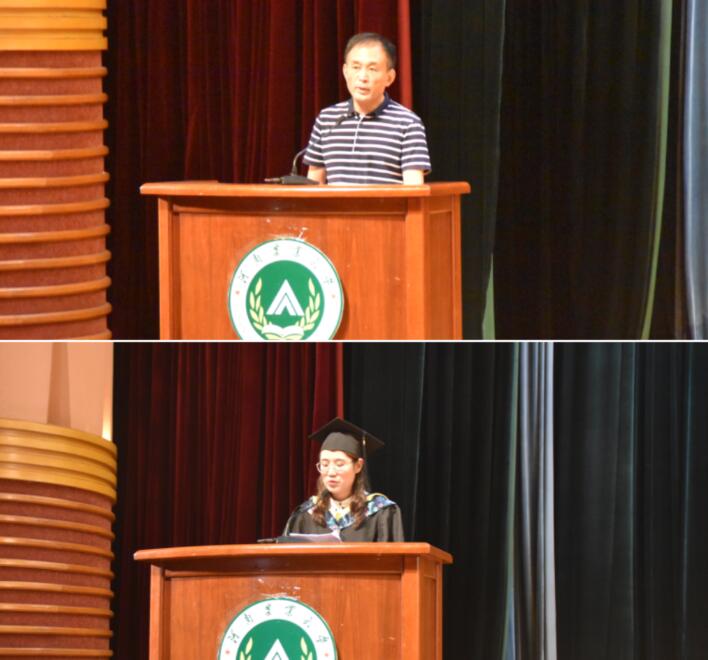 接下来,18届毕业生家长代表刘志强先生发言, 刘先生首先对圆满完成学业的同学们表示祝贺,并对学院领导、老师们表示感谢。他相信同学们圆满结束了四年的大学生活,都将带着各自的梦想,展翅高飞,开创未来。随后,毕业生代表刘婉茹同学发言,她代表同学们向辛勤付出的领导和老师表示衷心感谢,也祝愿同级的同学们在以后的日子中能够开启新的征程,奋力拼搏,实现自己的人生价值,创造更美的未来。