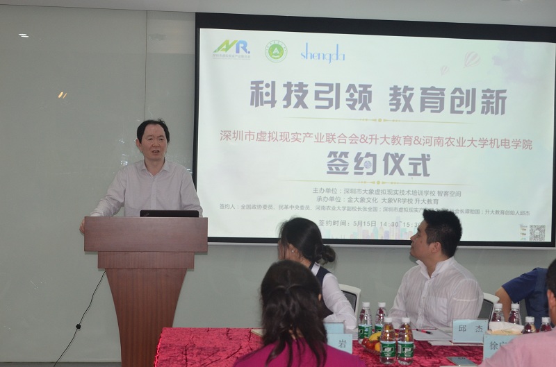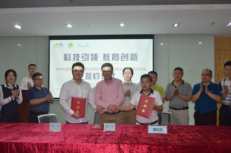 与深圳市虚拟现实产业联合会、深圳升大教育科技有限公司战略合作框架协议联合签署仪式在深圳市智谷科技园举行,共同确定联合成立VR教学创新示范中心。张全国副校长应邀出席,徐广印院长和部分教师代表参加签约仪式。