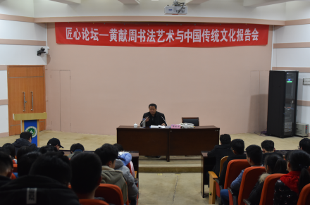 在报告会正式开始前,刘海涛向同学们简单介绍了黄献周老师独特的作品风格与杰出的书法艺术成就,激起了同学们学习书法的兴趣。会议伊始,黄献周就自己姓名的含义开始讲解,让同学们体会到浓厚的中华传统文化。他从汉字的演化讲起,描述了各阶段汉字的来源与特点,详细地介绍了中国古代书法文化艺术的起源与发展,并通过现场展示各种类别的书法,让大家直观地感受到书法的魅力。同时,他还以朝代为序,介绍了多位著名书法家的成长经历和艺术成就。黄献周以幽默的语言和渊博的学识对书法艺术与传统文化进行了精彩的讲解,并鼓励同学们积极响应时代号召,培养国学兴趣,提升自我文化素养,树立高度的文化自信,把中华传统文化发扬光大。