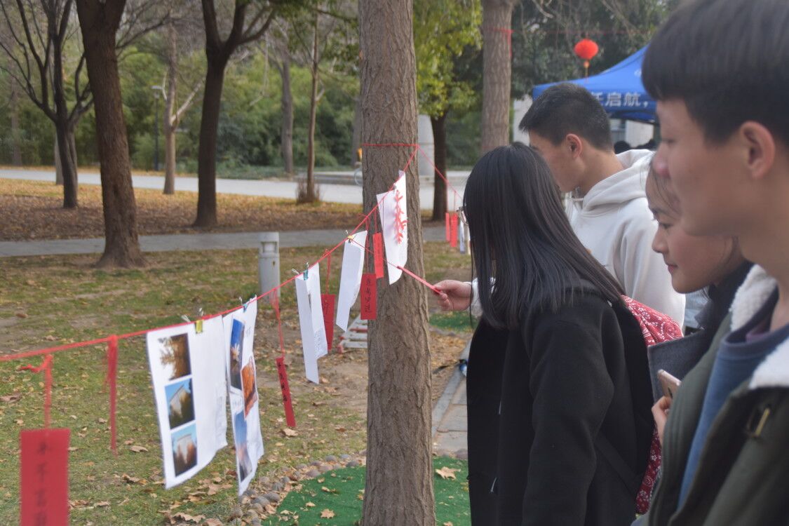 此次活动包括优秀作品展出和现场互动两个部分,活动现场共展出诗歌作品、摄影作品、书法作品、绘画作品逾百幅。这百幅风格各异的作品成为了校园中靓丽的风景,古色古香的汉服引人驻足。同时,活动现场进行的小游戏,让现场欢声笑语一片。“众里寻他”通过诗歌铭牌的配对,增进同学们对中国传统诗词歌赋的了解;“两人三足”、“你画我猜”小游戏分别通过两人合力运气球并挤爆取出诗句配对、一人比划诗句搭档猜题的方式进行,使得现场欢乐不断。参与者激情饱满,现场氛围一度高涨。活动进行过程中,“最美汉服”这一环节引燃全场,束上这翩翩玉衣,仿佛置身于那个诗意的朝代,吟一句诗,塑一方景,为空旷的广场增添了活力与朝气。活动现场准备了留言板,让同学们在这个寒冷的冬季留下属于自己的印迹。