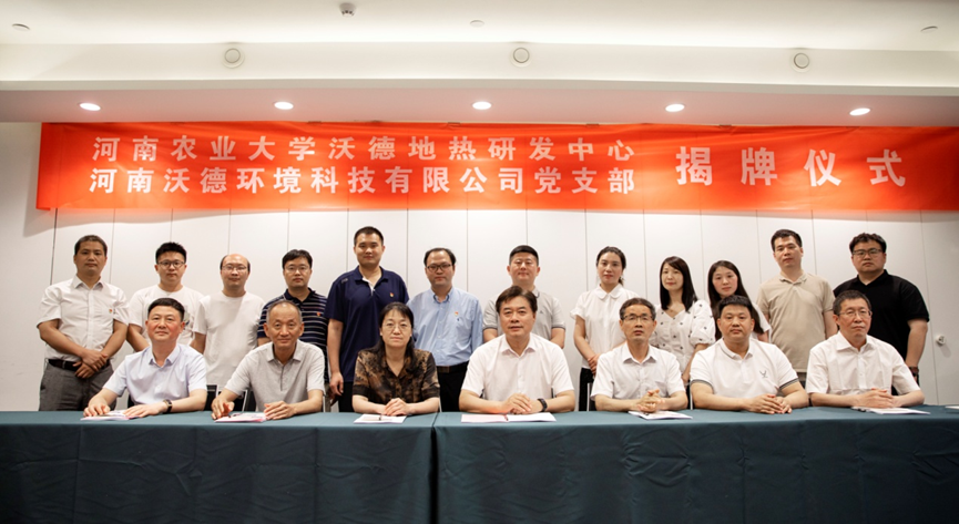 沃德地热研发中心”揭牌仪式在公司举行。校党委副书记、工会主席李成吾,省科技厅二级巡视员张芳,省住建厅原副厅长郭凤春,院党委书记李世欣,河南沃德环境科技有限公司董事长曹力锋、总经理王洪涛,出席仪式。能源工程系教工党支部书记贺超,以及能源系教师与公司代表,参加仪式。仪式由王洪涛主持。