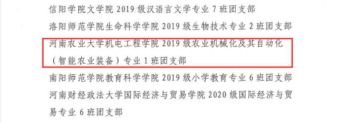 2019级农业机械化及其自动化(智能农业装备)1班团支部书记郭滨恺荣获河南学校共青团十佳“魅力团支书”;2019级农业机械化及其自动化(智能农业装备)1班团支部荣获百优“活力团支部”。