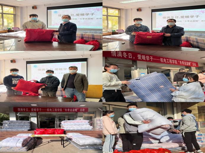 座谈会结束后,各领导老师及志愿者们为22级新生送去御寒保暖的棉被,并叮嘱同学们注意做好疫情防控,注意防寒保暖,在这段关键时期尽快调整好自己的学习状态,学院永远是大家最坚强的后盾。发放防寒物品传递的不仅仅是一床床棉被、褥子,而是学院与学子之间温情的碰撞,领取到防寒物品的学生们纷纷表示一定会带着这份爱与温暖努力前行,不负韶华,以机电为依托,放飞青春理想。