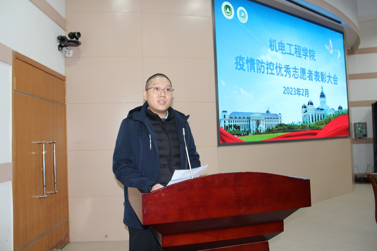 会上,学院书记李世欣宣读了疫情防控优秀志愿者名单,随后获此殊荣的老师依次上台领奖,这不仅是一份荣誉,更重要的是对老师们无私奉献精神的肯定和赞扬。能源工程系刘亮老师作为疫情防控优秀志愿者代表上台发言,他回顾了在桃李园抗击疫情期间的生活,在学院领导的带领下,志愿者老师们冒着被感染的风险吃住在校,不仅给学生送餐,还要给他们送人文关怀,缓解学生思想压力,言之凿凿,情之切切。