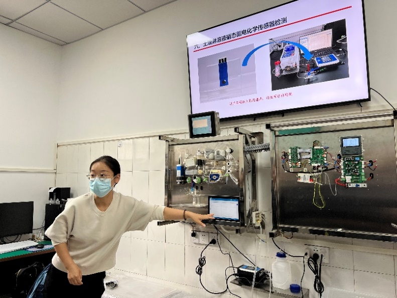 在淋溶液液测试室内,李振峰工程师和李兰兰博士分别向介校长汇报了控制系统设计、电化学硝态氮传感器研制及信号获取方式等。