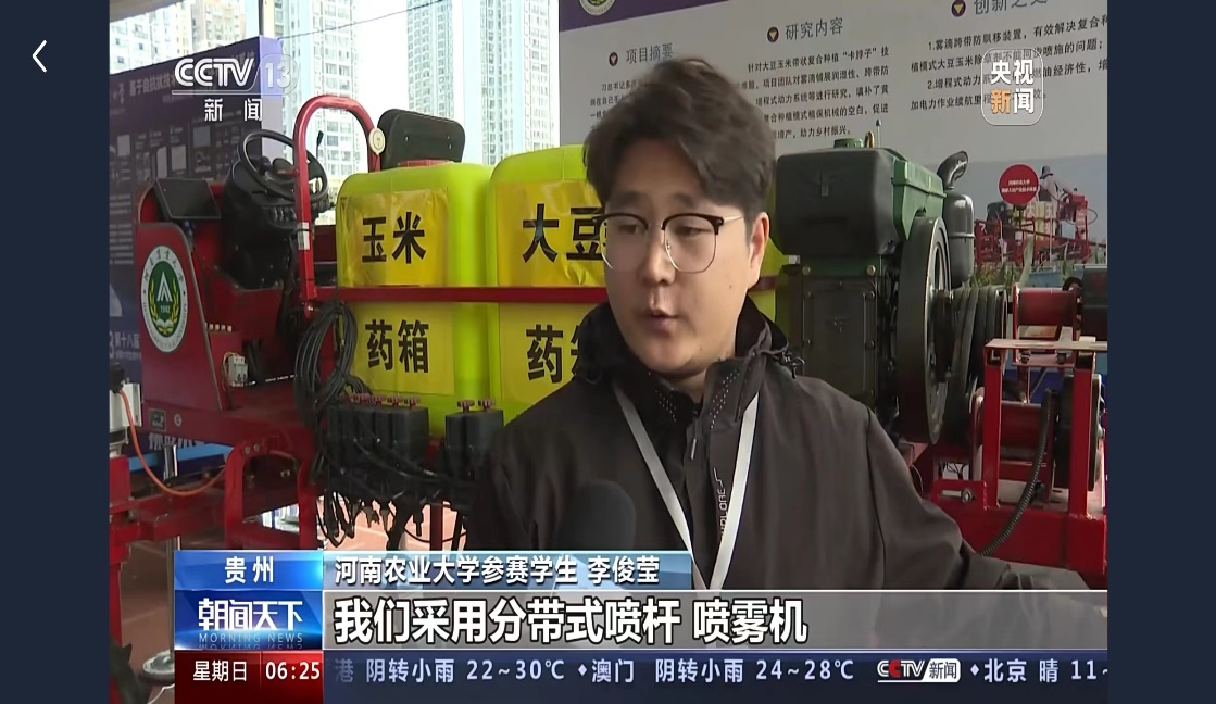 终审决赛期间,校、院领导高度重视,副校长郭战伟、校团委书记贾云飞、院长胡建军、院党委副书记宋晶、副院长王振锋亲临赛场,慰问指导成人影院 参赛师生,详细了解参赛情况并提出宝贵建议,对参赛队员的精心准备和努力付出给予高度评价,并鼓励大家要全力以赴,勇创佳绩。最终,经过激烈角逐,成人影院 崔功佩老师指导、李俊莹等同学参加项目《农田卫士——增程式多用途喷杆喷雾机》在科技发明制作类项目中取得学校历史性突破,荣获国赛二等奖,被中央电视台专题报道。充分彰显了成人影院 学子崇尚科学、追求真知、锐意创新的青春风貌。