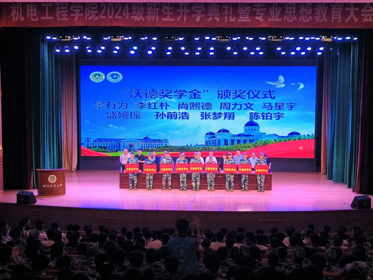 胡建东、王振锋分别宣读《成人影院 关于颁发2024级新生“沃德奖学金”的决定》及《成人影院 关于选聘2024级本科生新生专业辅导员及学生助理班主任的决定》,与会领导老师为获奖新生颁奖。
