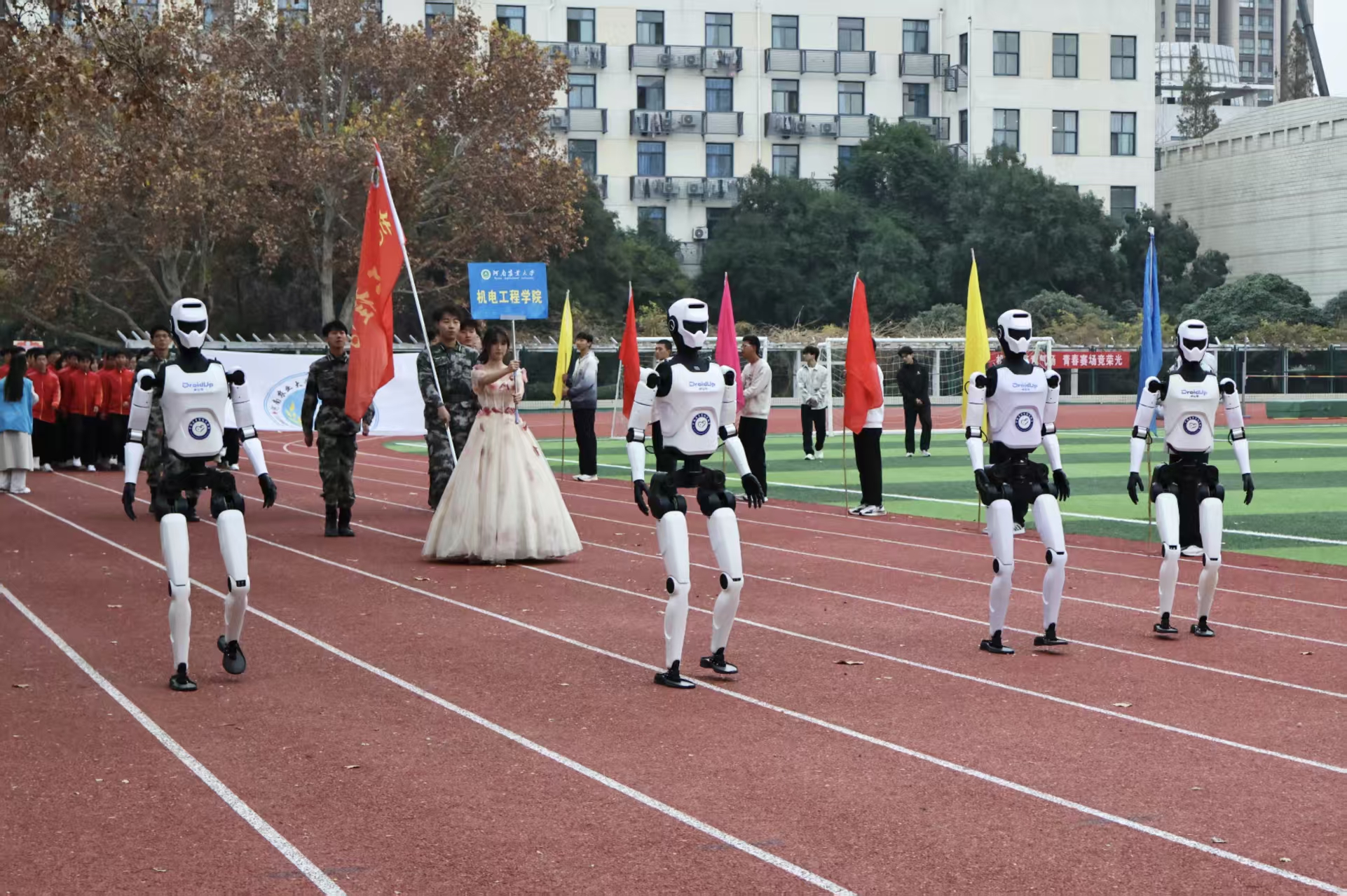 激昂的音乐奏响,开幕式正式拉开帷幕。首先,国旗护卫队迈着铿锵坚定的步伐,护送着五星红旗缓缓前行;随后,由机器人组成的方队登场,与舞蹈表演方队联袂献艺,灵活的机械动作搭配充满科技感的设计,将独特的机电特色展现得淋漓尽致;最后,彩旗队方阵迈着整齐步伐入场,方阵左侧的旗手们手持五彩斑斓的旗帜同步奔跑而来,以绚烂七彩昭示着蓬勃昂扬的青春热情。