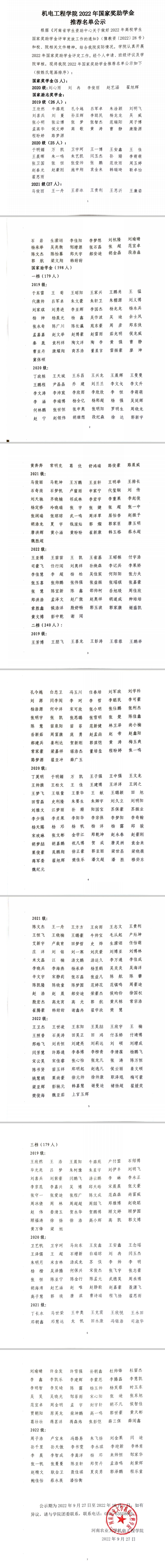 根据《河南省学生资助中心关于做好2022年高校学生国家奖助学金评审发放工作的通知》(豫教资[2022]28号)和校、院相关文件精神,结合成人影院 实际情况,学院认真开展2022年国家奖助学金评定工作,经个人申请、班级评议及学院审核,现将成人影院 2022年国家奖助学金推荐名单公示如下(按姓氏笔画排序):