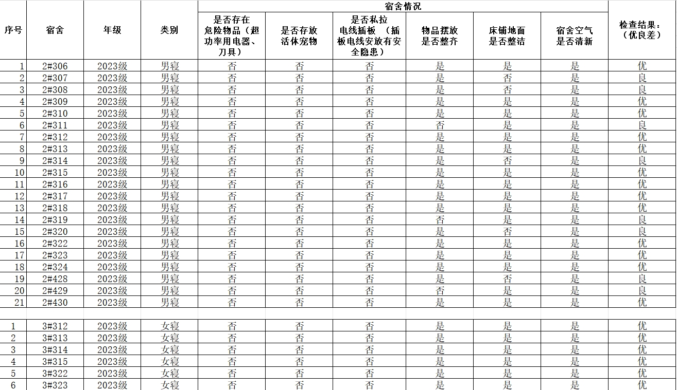 学院研究生会生活部对23级宿舍卫生安全检查情况公示如下: