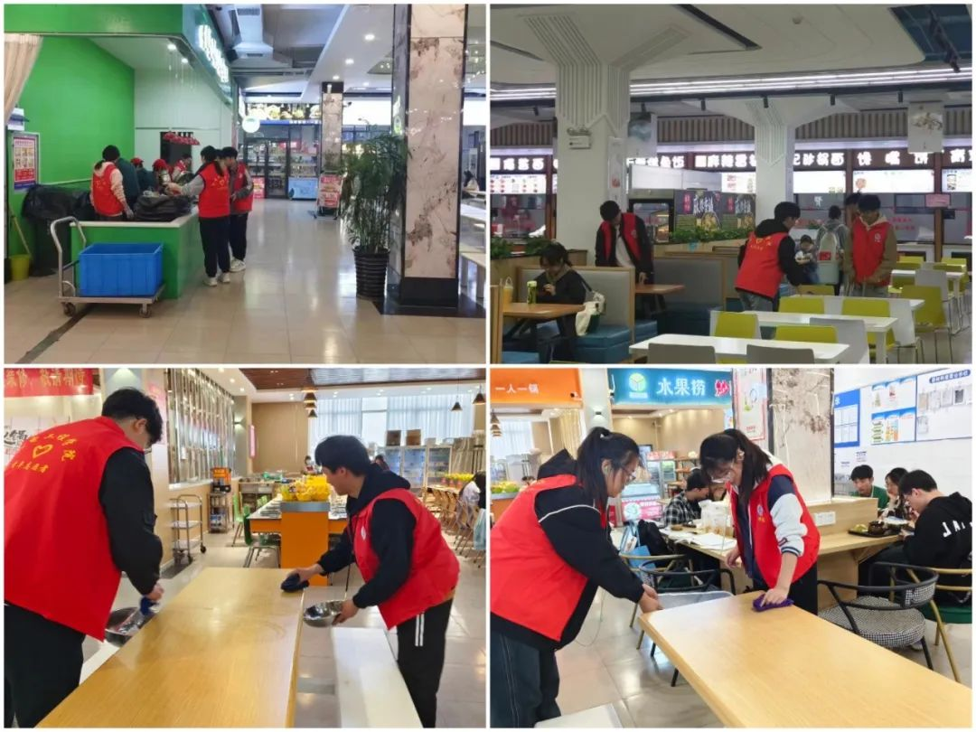 晨光熹微,志愿者提前到达场地,主动打扫卫生,为同学们营造一个干净卫生的就餐场地。在学生就餐高峰期,他们积极配合食堂服务人员,帮忙清理饭桌上的杂物,耐心引导同学们归还餐盘,维护食堂整洁有序的形象。志愿者们来回忙碌的身影,热情高涨的精神面貌构成了餐厅里一道靓丽的风景线。