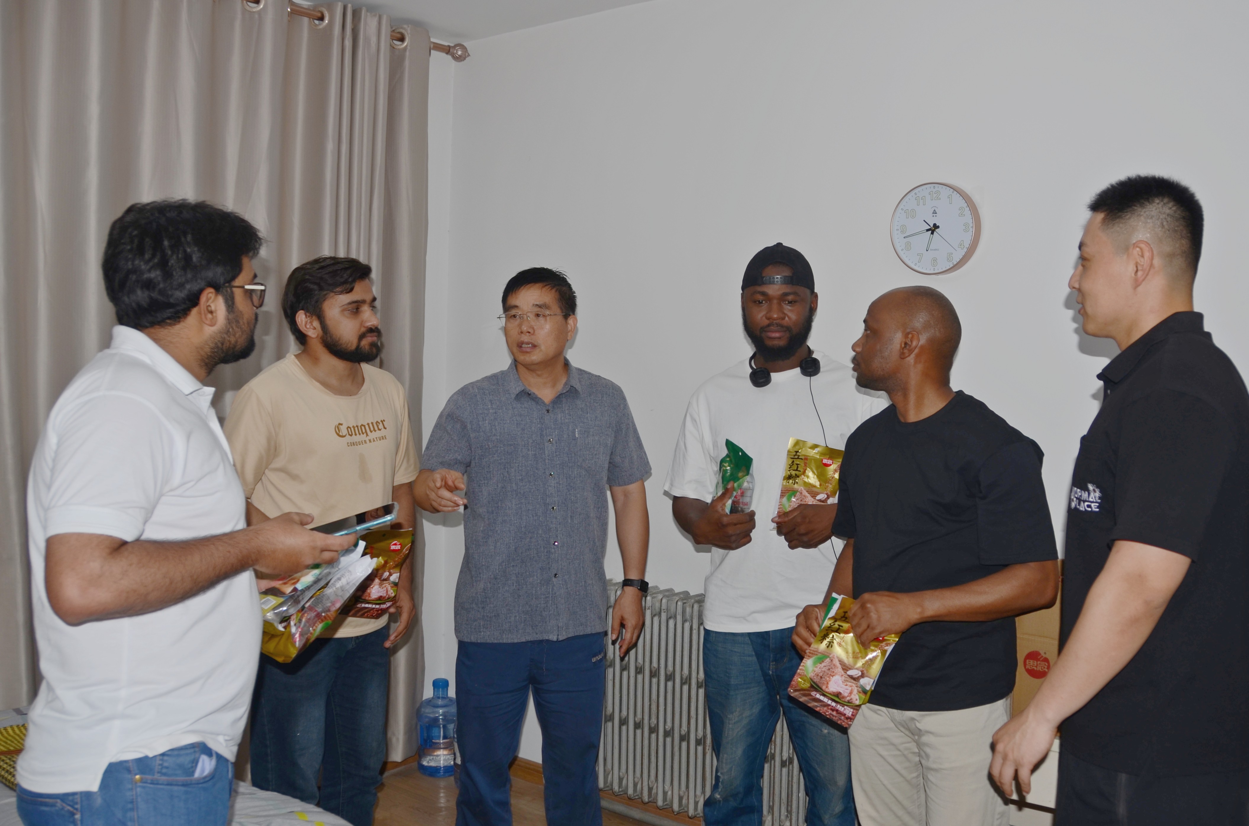 6月7日下午,副院长胡建东在研究生辅导员李锦的陪同下深入学院留学生学生宿舍,走访慰问留学生学习、生活状态,与留学生深入交流座谈。胡建东为留学生解读中国特色社会主义宗教理论与政策和中国端午节传统文化,希望留学生在刻苦学习的同时,能更多地了解中国优秀文化,成为中外交流的桥梁、文化的使者,为促进中国文化传播做出贡献。同时,对留学生宿舍安全提出要求,要求留学生严格要求自己,遵守学校学院的各项规章制度,度过一个美好,安全的留学生涯。