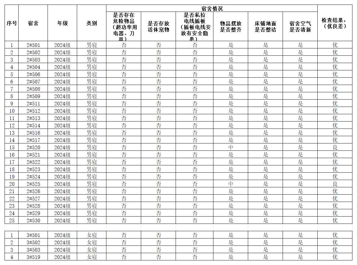 为加强成人影院 宿舍安全文明建设,促进学生全面发展,引导同学营造健康文明、积极向上的生活环境,学院研究生会生活部对24级宿舍进行安全卫生检查,检查情况公示如下: