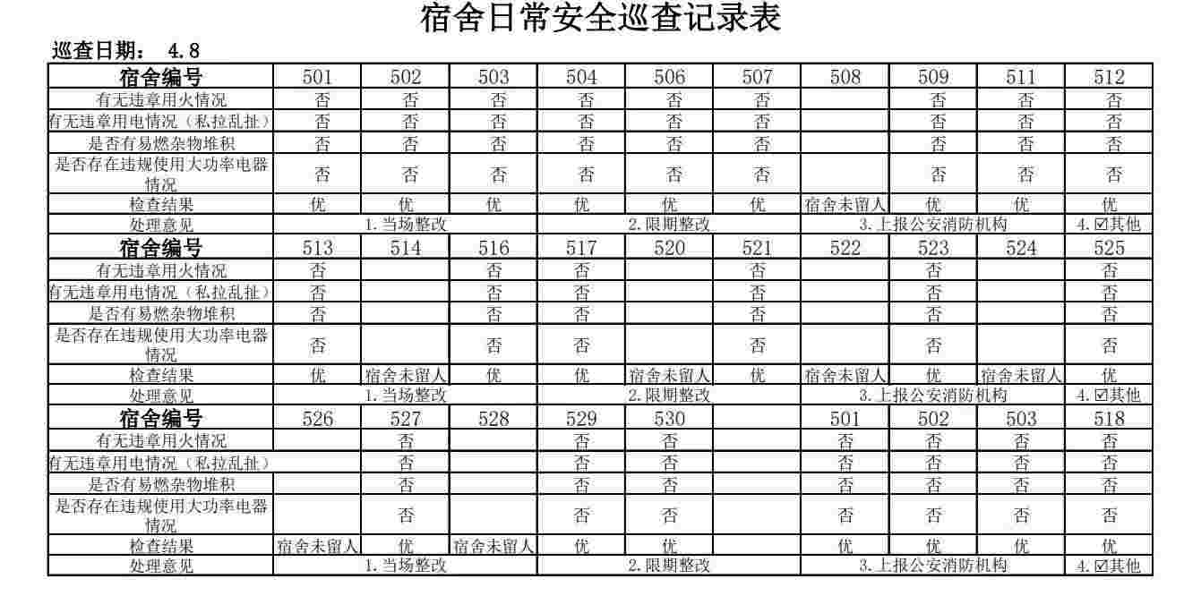 于2025年4月8日晚组织开展了学生宿舍卫生检查工作。采用分组抽查与全面检查相结合的方式,对宿舍卫生、用电安全及违禁物品等方面进行检查。现将检查情况总结下: