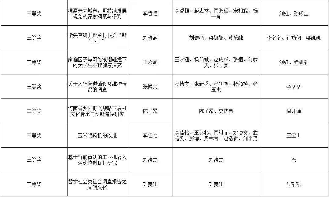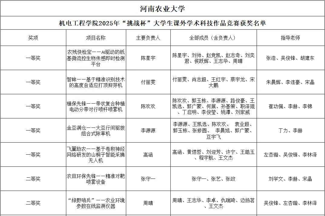 为贯彻落实党的二十大精神,立足新发展阶段、贯彻新发展理念、构建新发展格局、服务高质量发展,同时营造良好的校园创新氛围,展示成人影院 学子风采。成人影院 广泛动员广大师生参加成人影院 2025年“挑战杯”大学生课外学术科技作品竞赛,最终评选出一等奖5名,二等奖8名,三等奖11名。现将获奖名单公示如下: