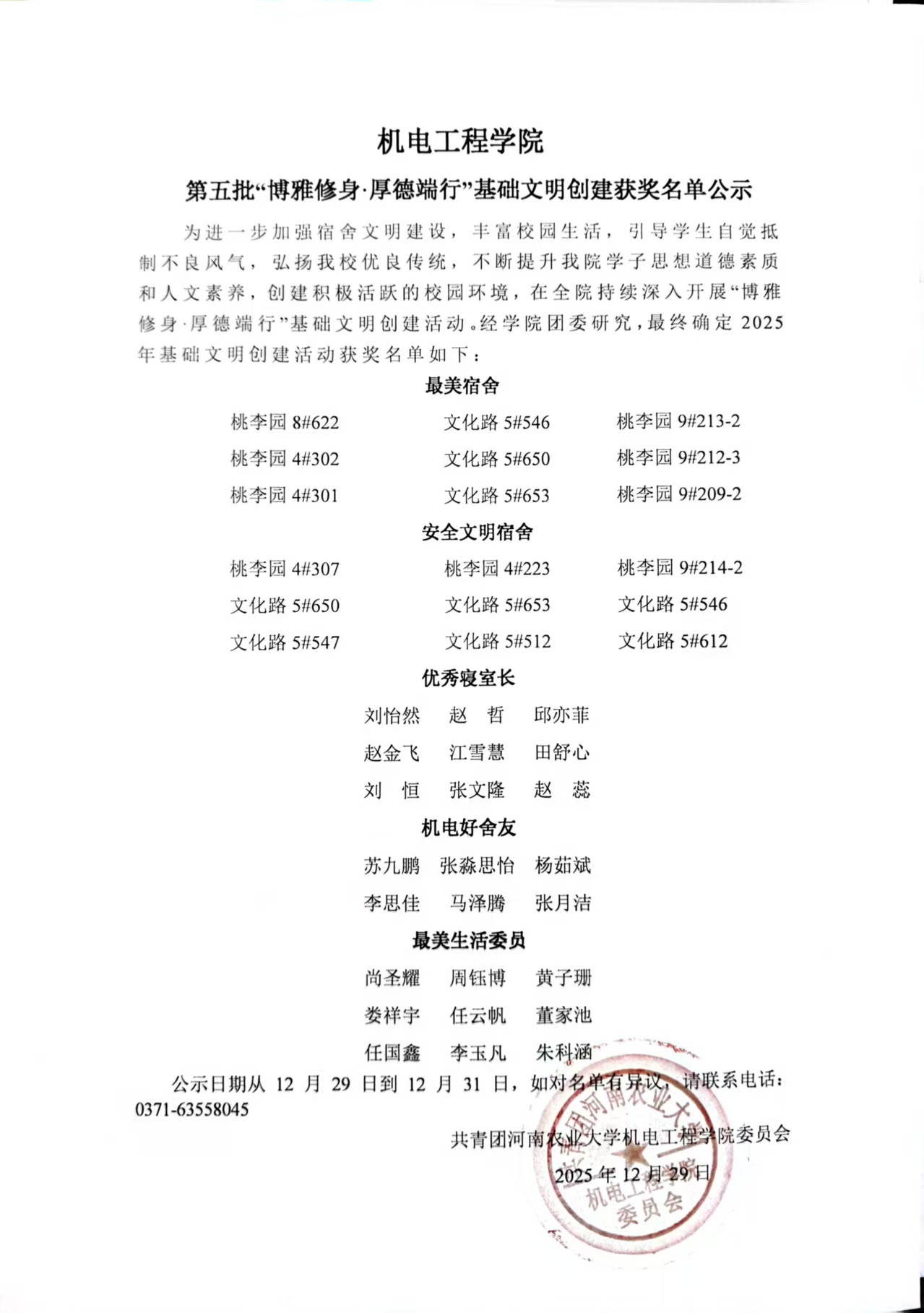 为切实加强宿舍文明建设、丰富校园文化生活,引导青年学生摒弃不良风气、传承我校优良传统,全面提升学子思想道德素质与人文修养,打造积极健康的育人环境,成人影院 深入推进 “博雅修身・厚德端行” 基础文明创建活动。经学院团委研究,2025 年该活动获奖名单确定如下: