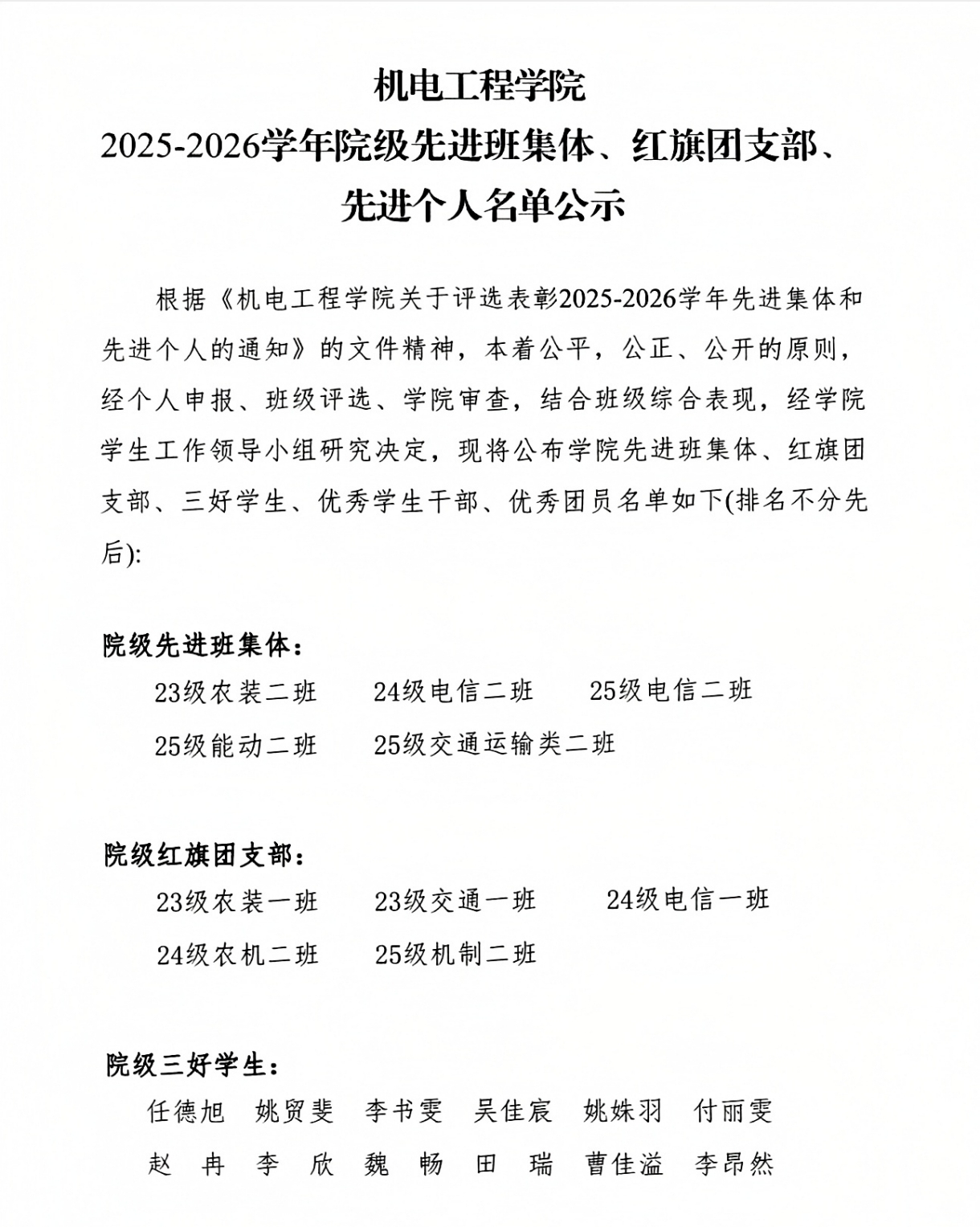 根据《成人影院 关于评选表彰2025-2026学年先进集体和先进个人的通知》的文件精神,本着公平,公正、公开的原则,经个人申报、班级评选、学院审查,结合班级综合表现,经学院学生工作领导小组研究决定,现将公布学院先进班集体、红旗团支部、三好学生、优秀学生干部、优秀团员名单如下(排名不分先后):