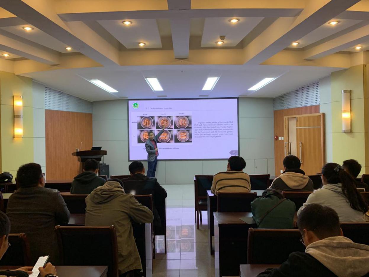 孙育峰首先表达了对青年学子的美好期望与祝福,随后以“PLA/wood/starch复合材料的性能研究”为题,对其在美国路易斯安那州立大学访学期间开展的科研项目进行了介绍。他从路易斯安那州立大学的校园与科研环境、项目背景以及研究内容等三个方面展开,详细讲解了PLA/wood/starch复合材料对3D打印技术的开发帮助,并对下一步研究计划和行业领域未来的发展方向进行了叙述与展望。问答环节中,孙育峰对同学们的踊跃提问一一进行耐心解答。