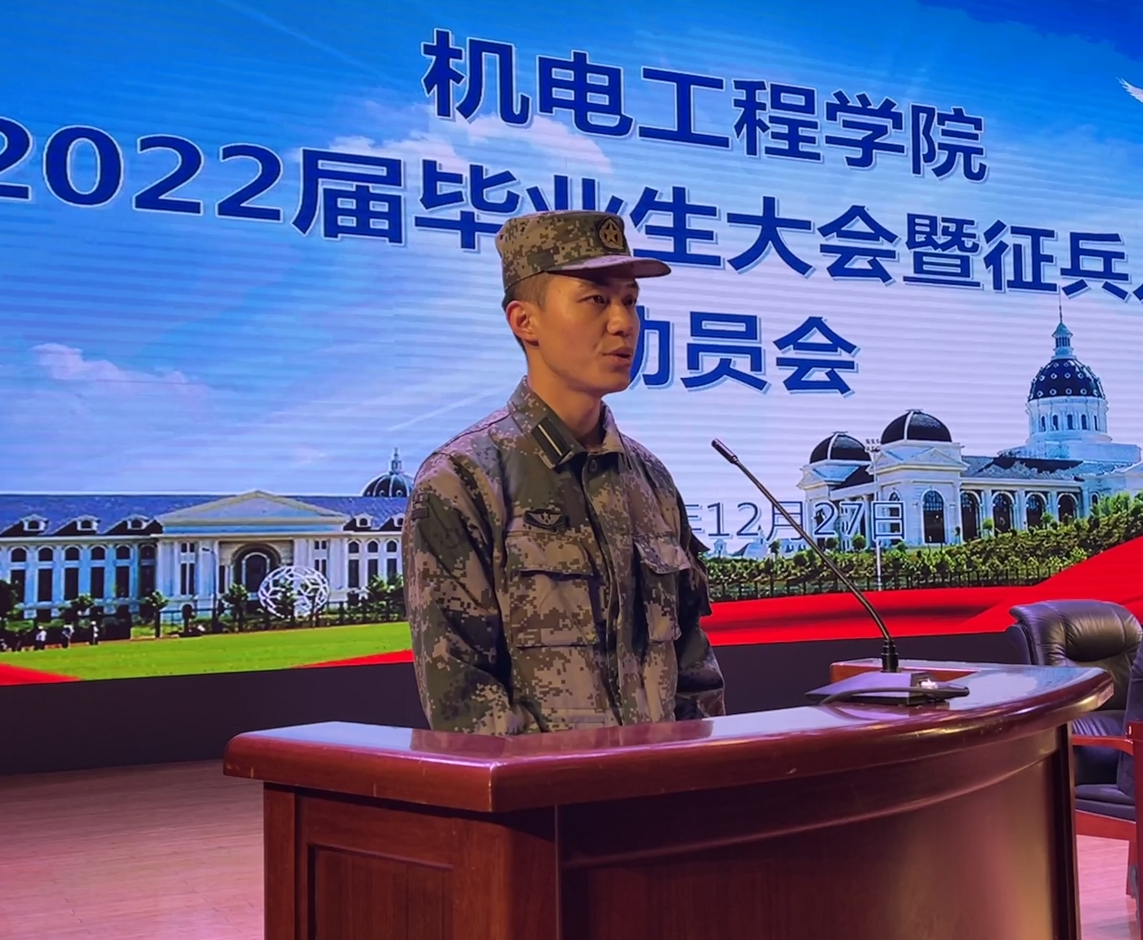 退伍大学生代表、19级电信一班的康隆源同学进行发言。他首先对在座的学长学姐表达了美好的祝福,随即结合自身经历讲述了军队生活使他收获了军人的铁血精神和面对困难永不退缩的信念,鼓励大家能够积极投身军营,用奋斗和热血勇担时代使命。