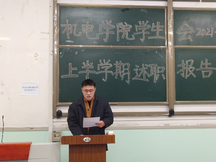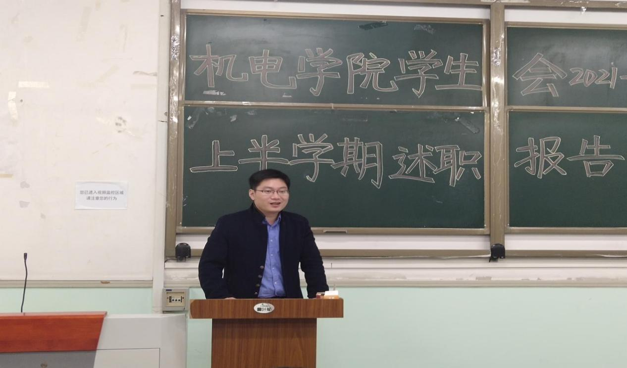 紧接着,邓文龙对学生会本学期工作进行整体述职总结。他首先对各部门成员长期以来的工作予以充分肯定并表示感谢。随后,他结合明年将要举办的院运会、校运会与校庆三个方面的工作内容对各部门成员提出具体要求。他表示,在新的一年里,学生会各个部门将进一步加强自身建设,不断开拓思路,完善自我素质与工作水平,继续开展彰显机电特色的学生活动,落实全心全意为同学们服务的宗旨。