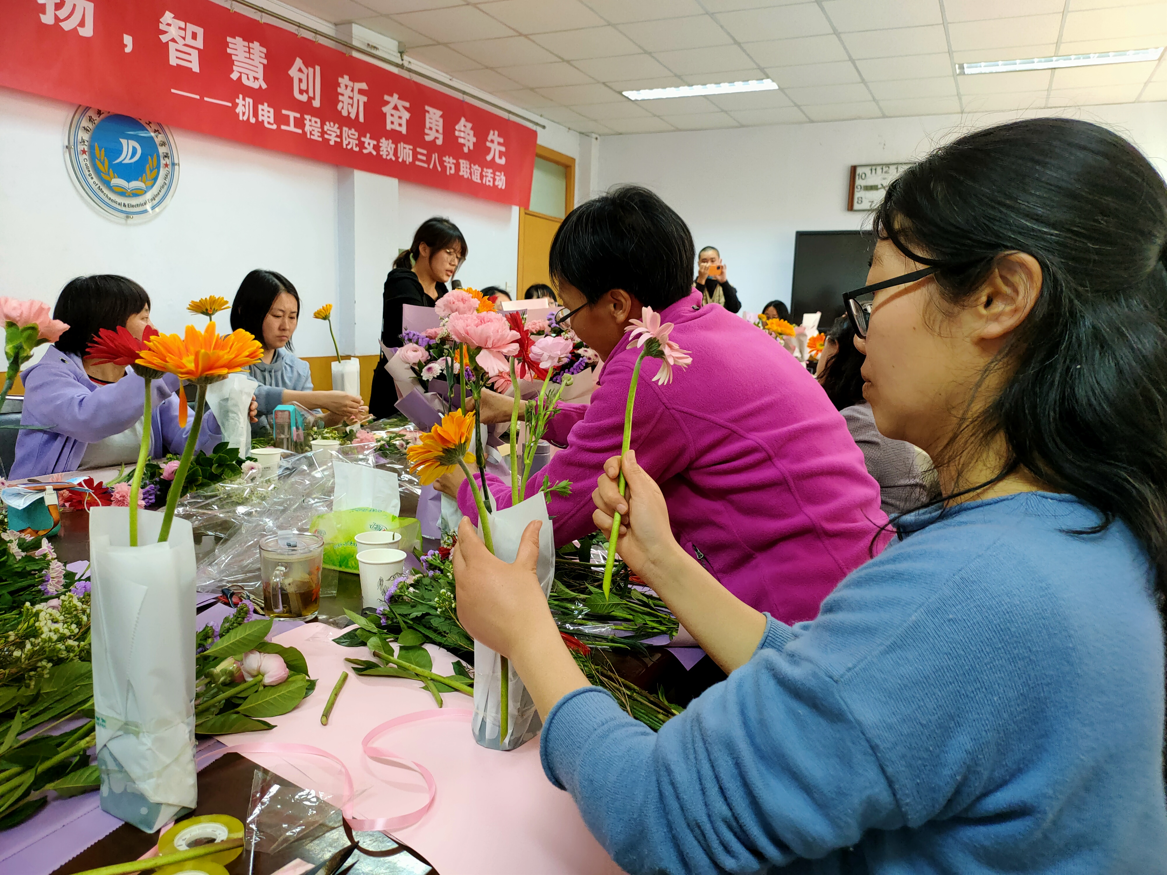 党委书记李世欣为奉献在教师、科研一线的女教师代表献花,向她们致以最诚挚的祝福,衷心祝愿女教职工们节日快乐、健康平安、青春永驻!副院长、国家二级心理咨询师、催眠师刘淑杰现场开展“做自己的女神”主题讲座,讲述情绪管理的含义及三个层次、情绪处理的常用方法,通过正念冥想等控制情绪,最后各位老师体验催眠放松方式。随后插花活动正式开始,洋牡丹、康乃馨、勿忘我、非洲菊、澳洲腊梅等一朵朵漂亮的花经过老师们悉心修剪、细心搭配造型,形成错落有致、创意十足的插花作品,令人赏心悦目。