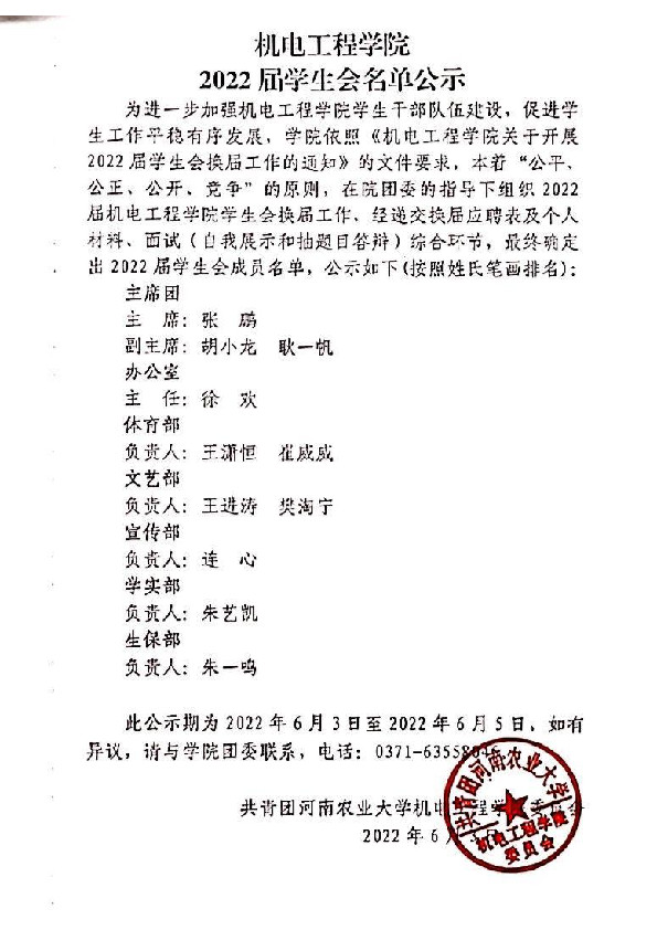 为进一步加强成人影院 学生干部队伍建设,促进学生工作平稳有序发展,学院依照《成人影院 关于开展2022届学生会换届工作的通知》的文件要求,本着“公平、公正、公开、竞争”的原则,在院团委的指导下组织2022届成人影院 学生会换届工作,经递交换届应聘表及个人材料、面试(自我展示和抽题目答辩)综合环节,最终确定出2022届学生会成员名单,公示如下(按照姓氏笔画排名):
