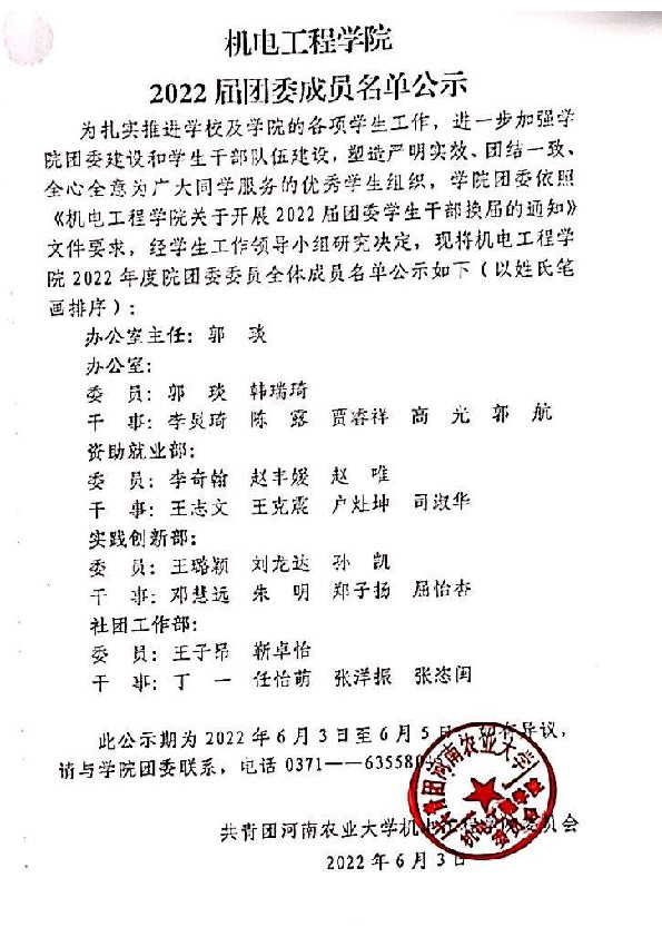 为扎实推进学校及学院的各项学生工作,进一步加强学院团委建设和学生干部队伍建设,塑造严明实效、团结一致、全心全意为广大同学服务的优秀学生组织,学院团委依照《成人影院 关于开展2022届学生干部换届的通知》文件要求,经学生工作领导小组研究决定,现将成人影院 2022年度院团委委员全体成员名单公示如下(以姓氏笔画排序):