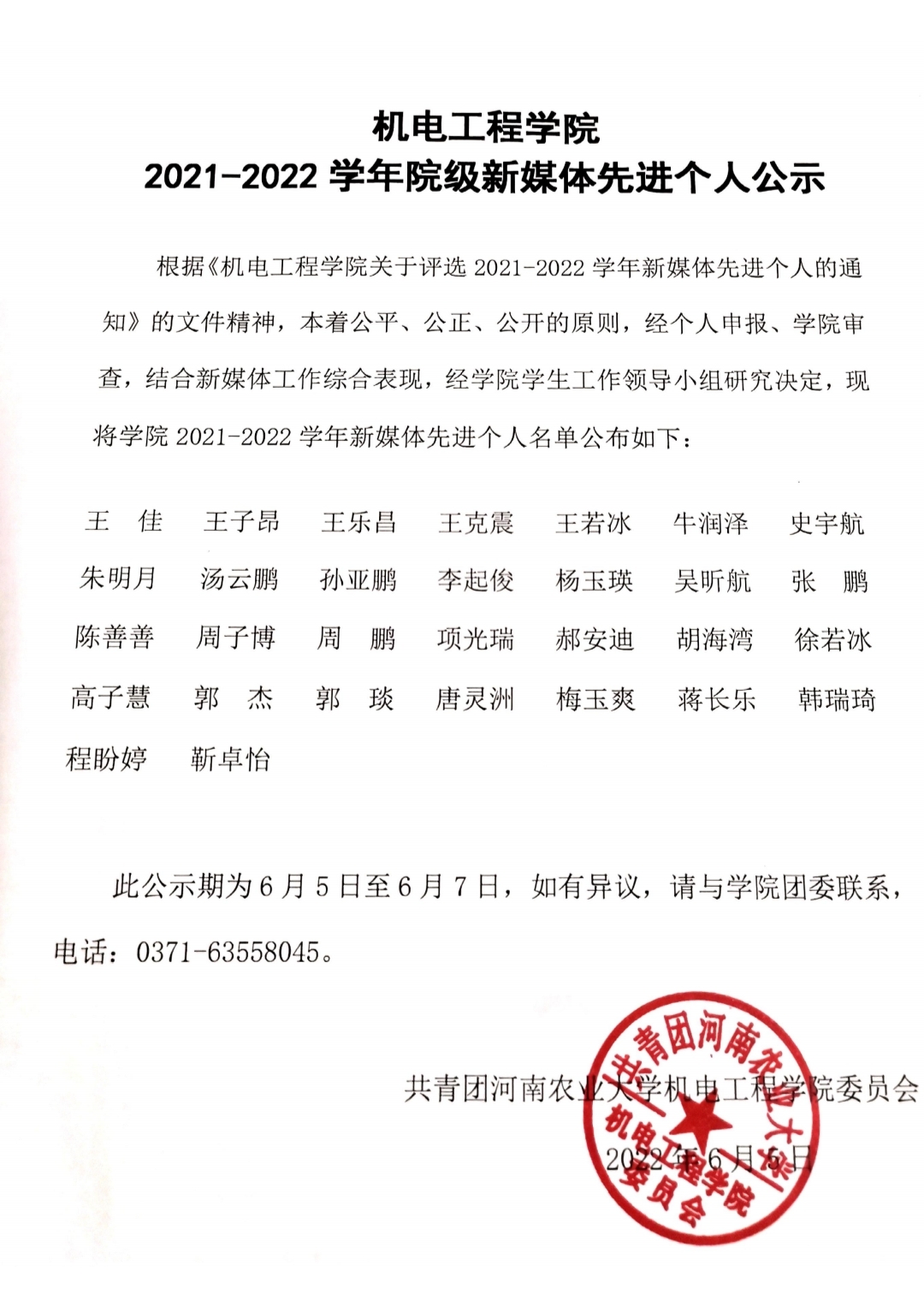 根据《成人影院 关于评选2021-2022学年新媒体先进个人的通知》的文件精神,本着公平、公正、公开的原则,经个人申报、学院审查,结合新媒体工作综合表现,经学院学生工作领导小组研究决定,现将学院2021-2022学年新媒体先进个人名单公示如下: