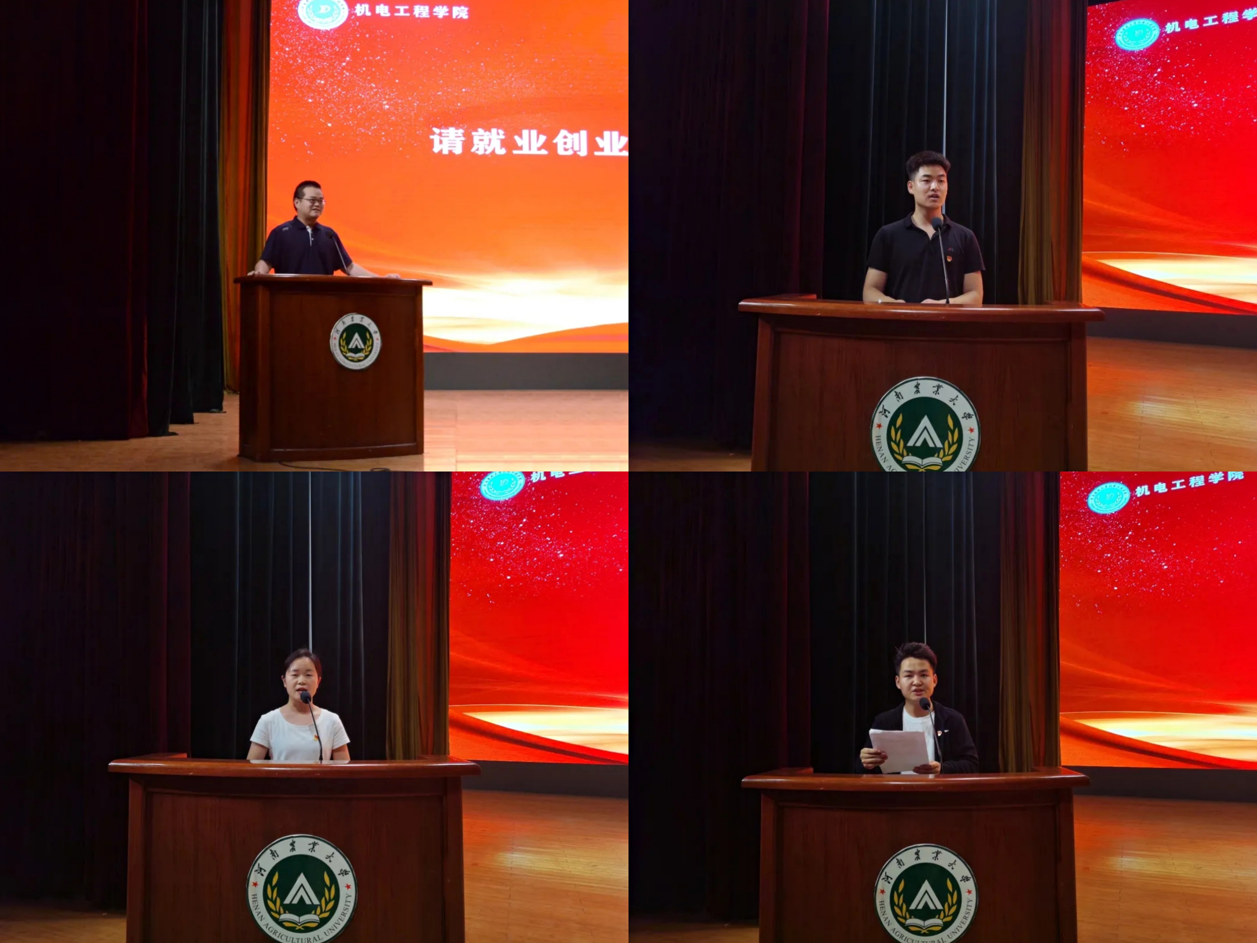 紧接着,部分受表彰的先进集体与先进个人代表上台发言,他们分别是:就业创业先进集体代表姚森老师,优秀毕业生代表赵志强,先进集体代表河南省五四红旗团支部2018级交通运输一班赵燕美,先进个人代表院学生会主席陈世豪,优秀运动员代表第52届校运会3000米和5000米双冠军获得者范森森。