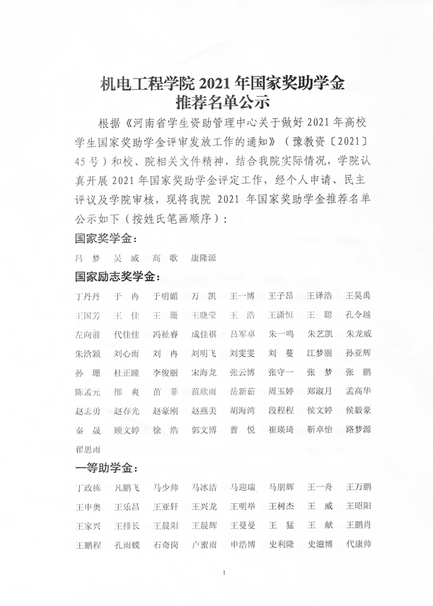 根据《河南省学生资助管理中心关于做好2021年高校学生国家奖助学金评审发放工作的通知》(豫教资[2021]45号)和校、院相关文件精神,结合成人影院 实际情况,学院认真开展2021年国家奖助学金评定工作,经个人申请、民主评议及学院审核,现将成人影院 2021年国家奖助学金推荐名单公示如下(按姓氏笔画顺序)