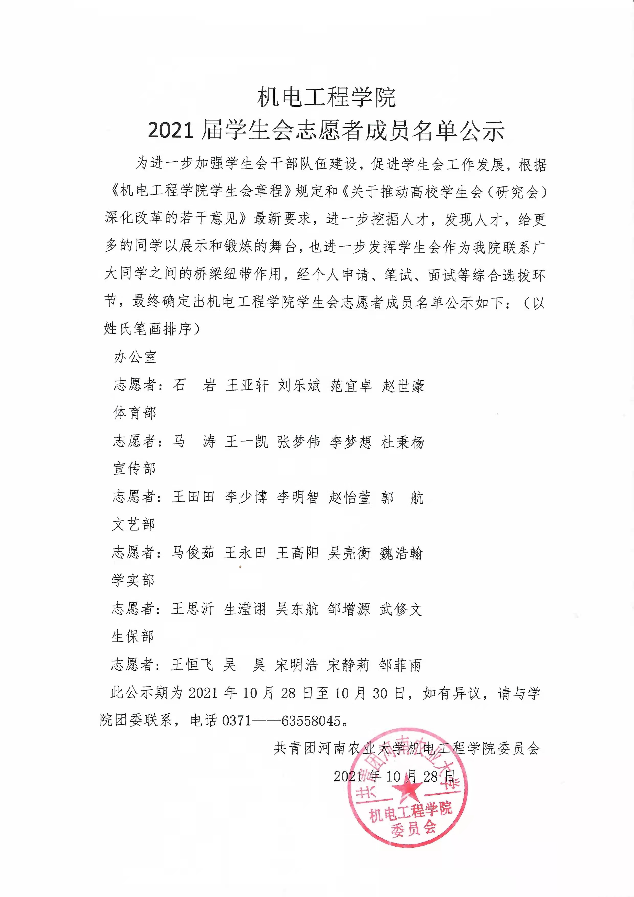 为进一步加强学生会干部队伍建设,促进学生会工作发展,根据《成人影院 学生会章程》规定和《关于推动高校学生会(研究会)深化改革的若干意见》最新要求,进一步挖掘人才,发现人才,给更多的同学以展示和锻炼的舞台,也进一步发挥学生会作为成人影院 联系广大同学之间的桥梁纽带作用,经个人申请、笔试、面试等综合选拔环节,最终确定出成人影院 学生会志愿者成员名单公示如下:(以姓氏笔画排序)
