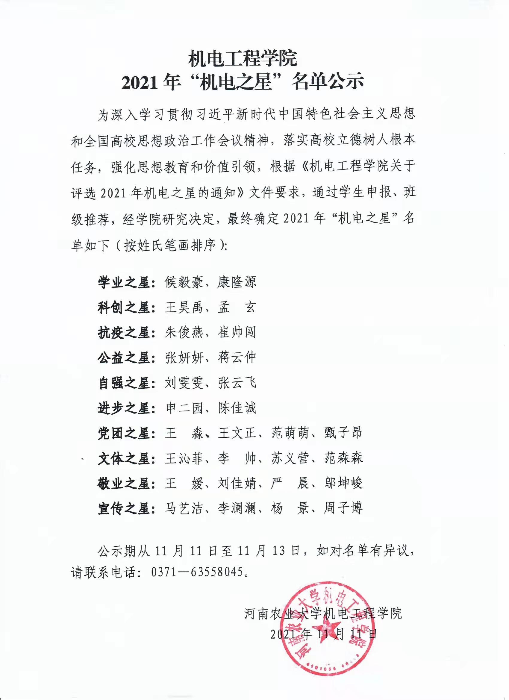 为深入学习贯彻习近平新时代中国特色社会主义思想和全国高校思想政治工作会议精神,落实高校立德树人根本任务,强化思想教育和价值引领,根据《成人影院 关于评选2021年机电之星的通知》文件要求,通过学生申报、班级推荐,经学院研究决定,最终确定2021年“机电之星”名单如下(按姓氏笔画排序):