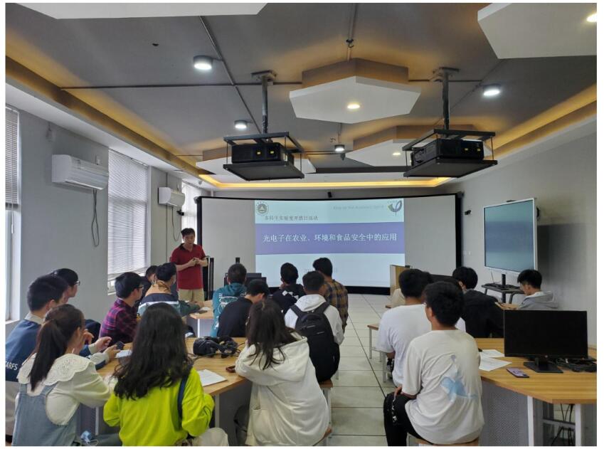 副院长胡建东教授为本次活动精心准备了专题报告,介绍了此次活动的主要内容和流程,并结合最新研究成果向大家阐明了光电子学在农业、环境和食品安全等领域中的重要应用意义和价值。期间还将光电子学技术与同学们所学课程相联系,分别介绍了专业基础课、核心课在实际应用中的重要作用。报告激发了同学们的极大兴趣,同学们带着对光电子如何应用于农业领域的好奇心和求知欲开启了实验室的探索之旅。