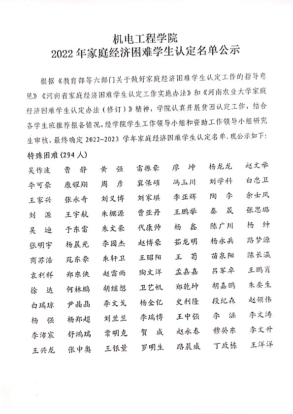 根据《教育部等六部门关于做好家庭经济困难学生认定工作的指导意见》《河南省家庭经济困难学生认定工作实施办法》和《成人影院 家庭经济困难学生认定办法(修订)》精神,学院认真开展贫困认定工作,结合各学生班推荐报备情况,经学院学生工作领导小组和资助工作领导小组研究生审核,最终确定2022-2023 学年家庭经济困难学生认定名单,现公示如下: