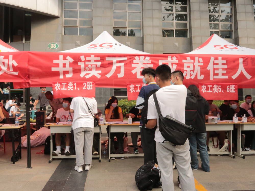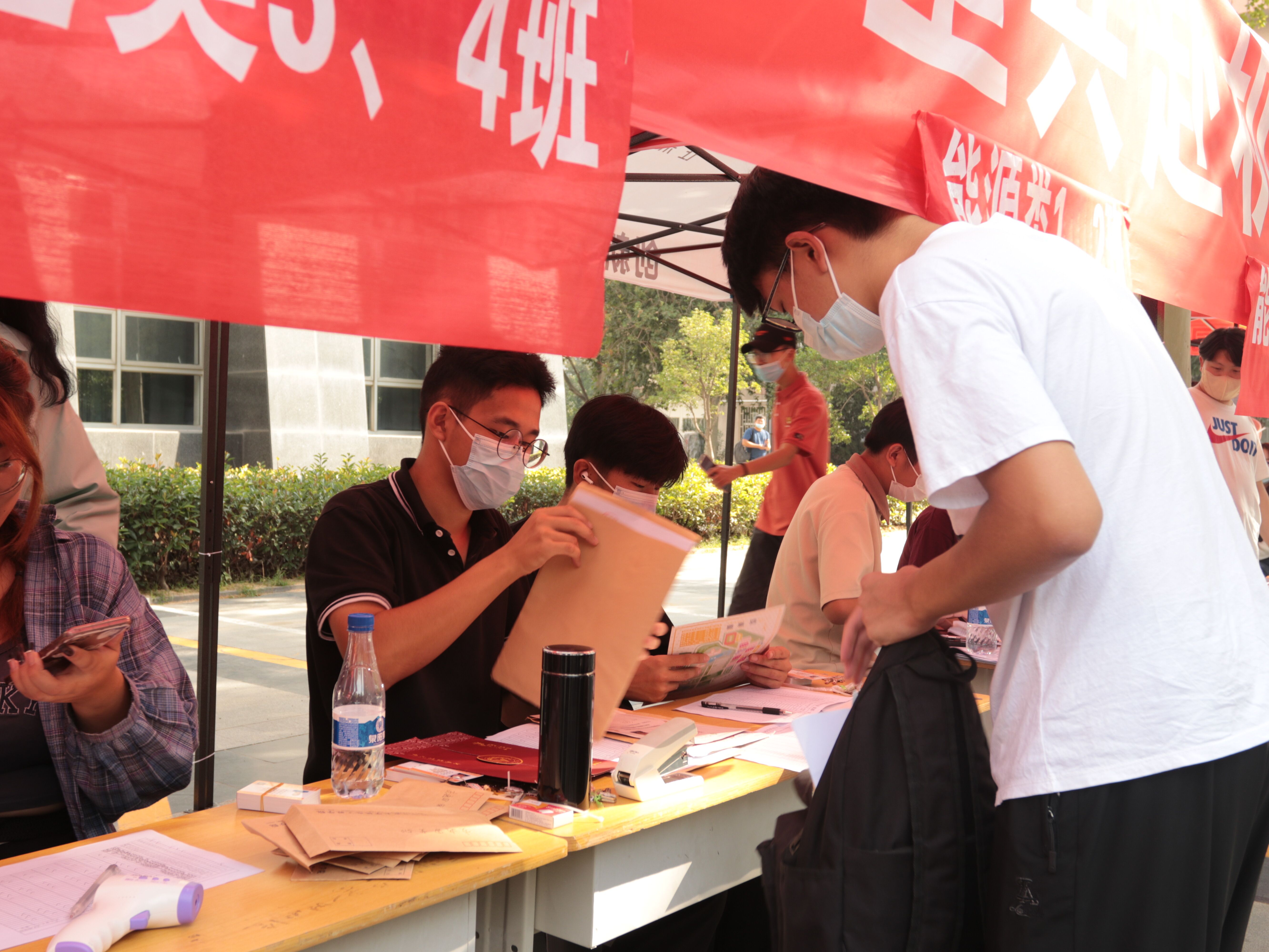 学生工作人员和学生志愿者提前抵达报到地点分工就位,在他们的努力之下,整理资料档案、摆放桌椅板凳、张贴班级横幅等各项准备工作有条不紊地进行着。