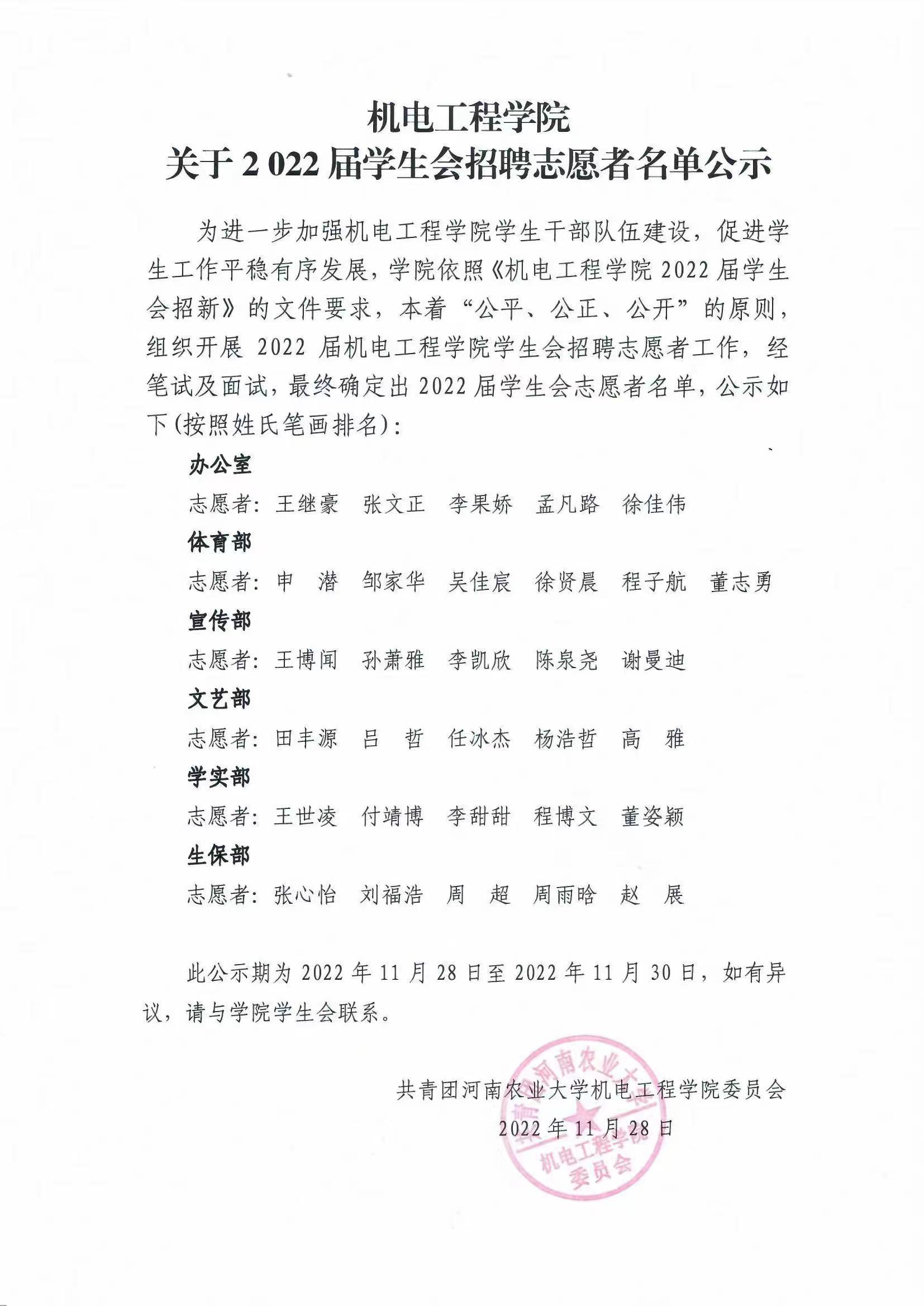 为进一步加强成人影院 学生干部队伍建设,促进学生工作平稳有序发展,学院依照《成人影院 2022届学生会招新》的文件要求,本着“公平、公正、公开”的原则,组织开展2022届成人影院 学生会招新工作,经递交报名表、笔试及面试(自我展示和题目答辩)综合环节,最终确定出2022届学生会新成员名单,公示如下(按照姓氏笔画排名):