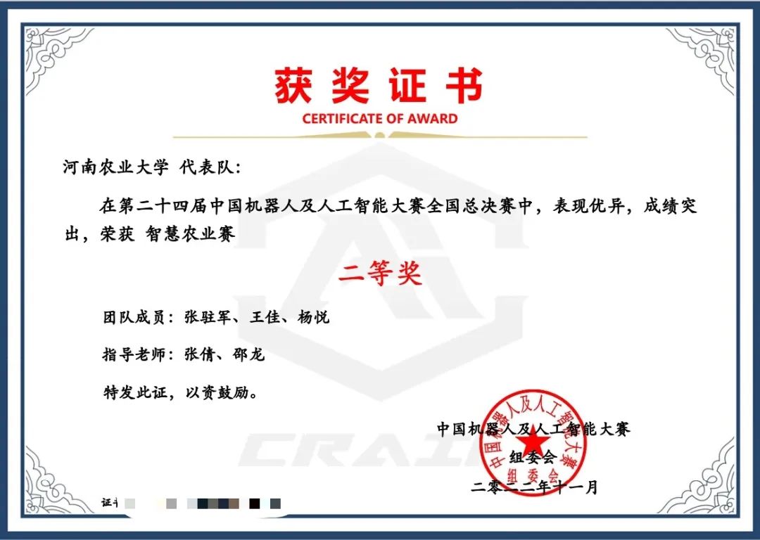 由赵宁、李鹏飞老师指导,黄泽全、陈建行、刘涛同学组建的团队取得智慧农业赛一等奖;由黄会男、陈永老师指导,王佳、赵唯、张轲同学组建的团队取得智慧农业赛一等奖;由张倩、邵龙老师指导,张驻军、王佳、杨悦同学组建的团队取得智慧农业赛二等奖;由肖亚涛、王栋老师指导,刘恩光、黄泽全、关争气同学组建的团队取得智慧农业赛优秀奖;由刘晓潺、周培林老师指导,陈建行、张驻军、王帅智同学组建的团队取得智慧农业赛优秀奖;由丁攀、商俊娟老师指导,张轲、刘恩光、李云飞同学组建的团队取得智慧农业赛优秀奖。