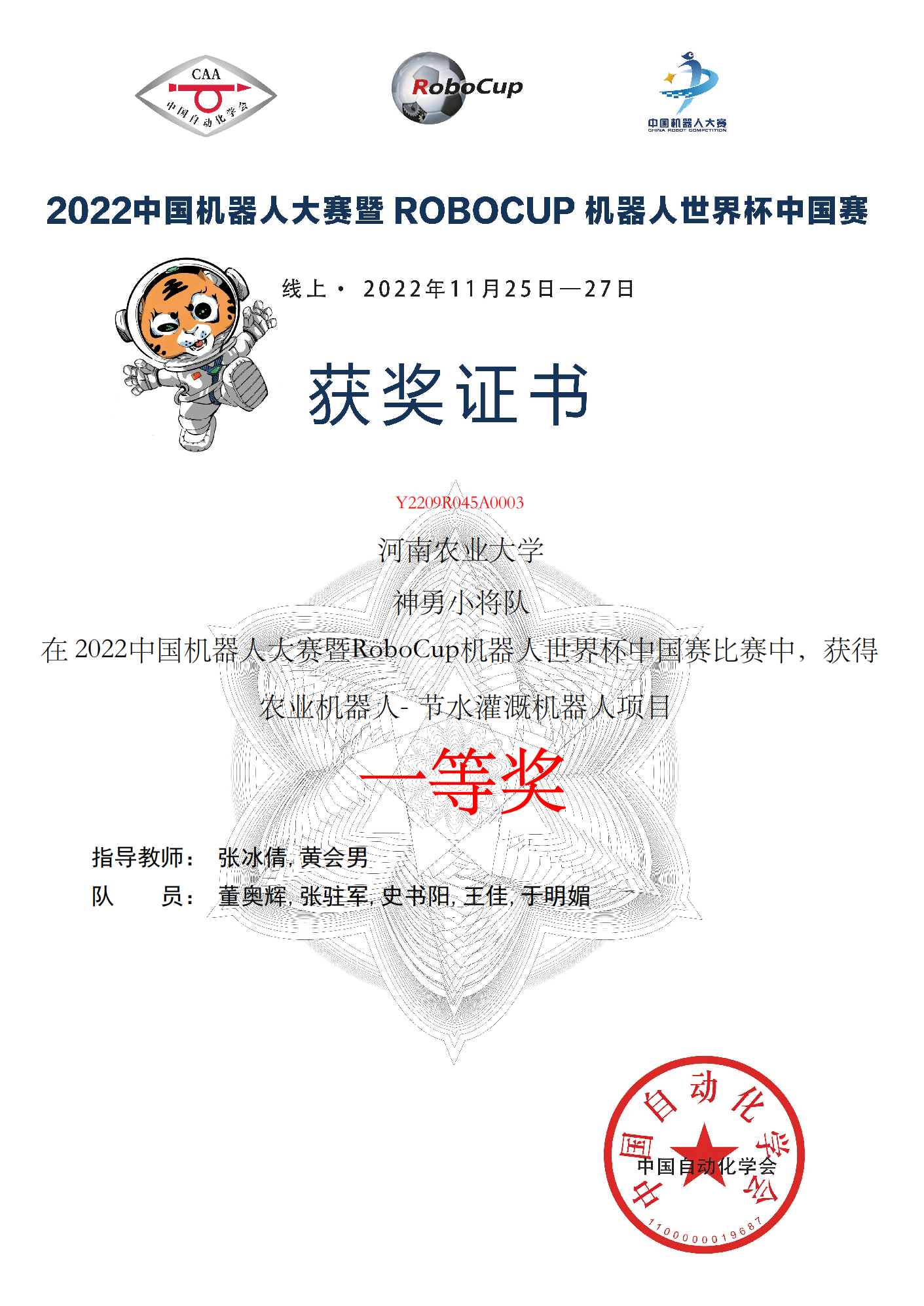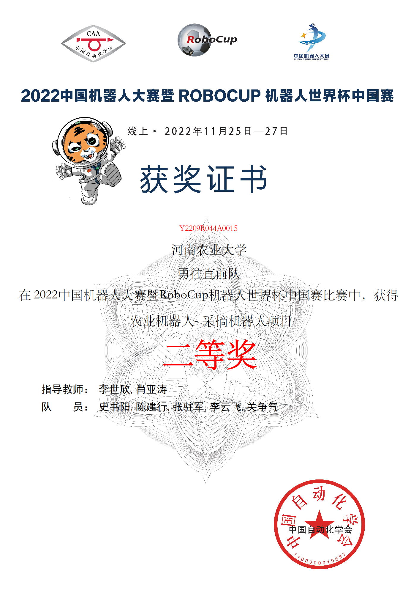 由张冰倩、黄会男老师指导,董奥辉、张驻军、史书阳、王佳、于明媚同学组建的团队取得节水灌溉项目一等奖;由宋晶、李鹏飞老师指导,陈建行、黄泽全、张轲、吴亦斐、王帅智同学组建的团队取得节水灌溉项目二等奖;由李世欣、肖亚涛老师指导,史书阳、陈建行、张驻军、李云飞、关争气同学组建的团队取得采摘机器人项目二等奖;由丁攀、陈永老师指导,黄泽全、张轲、董奥辉、王帅智、刘涛同学组建的团队取得智慧农业赛三等奖。
