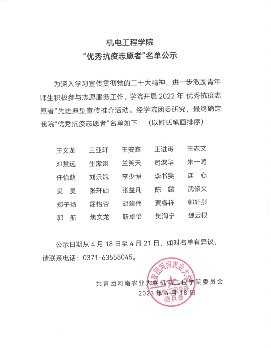 为深入学习宣传贯彻党的二十大精神,进一步激励青年师生积极参与志愿服务工作,学院开展2022年“优秀抗疫志愿者”先进典型宣传推介活动。经学院团委研究,最终确定成人影院 “优秀抗疫志愿者”名单如下:(以姓氏笔画排序)