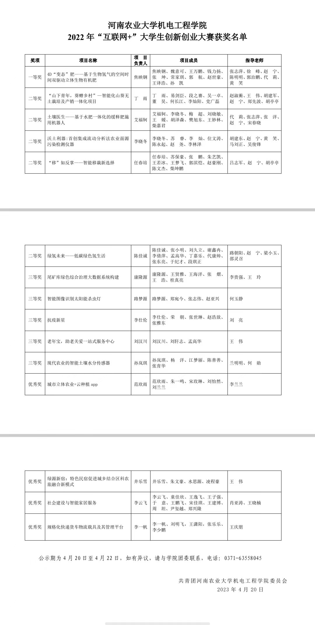为贯彻落实河南省教育厅等部门《关于举办2022年河南省“互联网+”大学生创新创业大赛》文件精神,进一步激发学生创新创业热情,展示学院创新创业教育成果,不断提高创新创业人才培养水平,成人影院 广泛动员,积极组织开展了2022年“互联网+”大学生创新创业大赛,最终评选出一等奖1名,二等奖5名,三等奖5名,优秀奖4名。现将获奖名单公示如下: