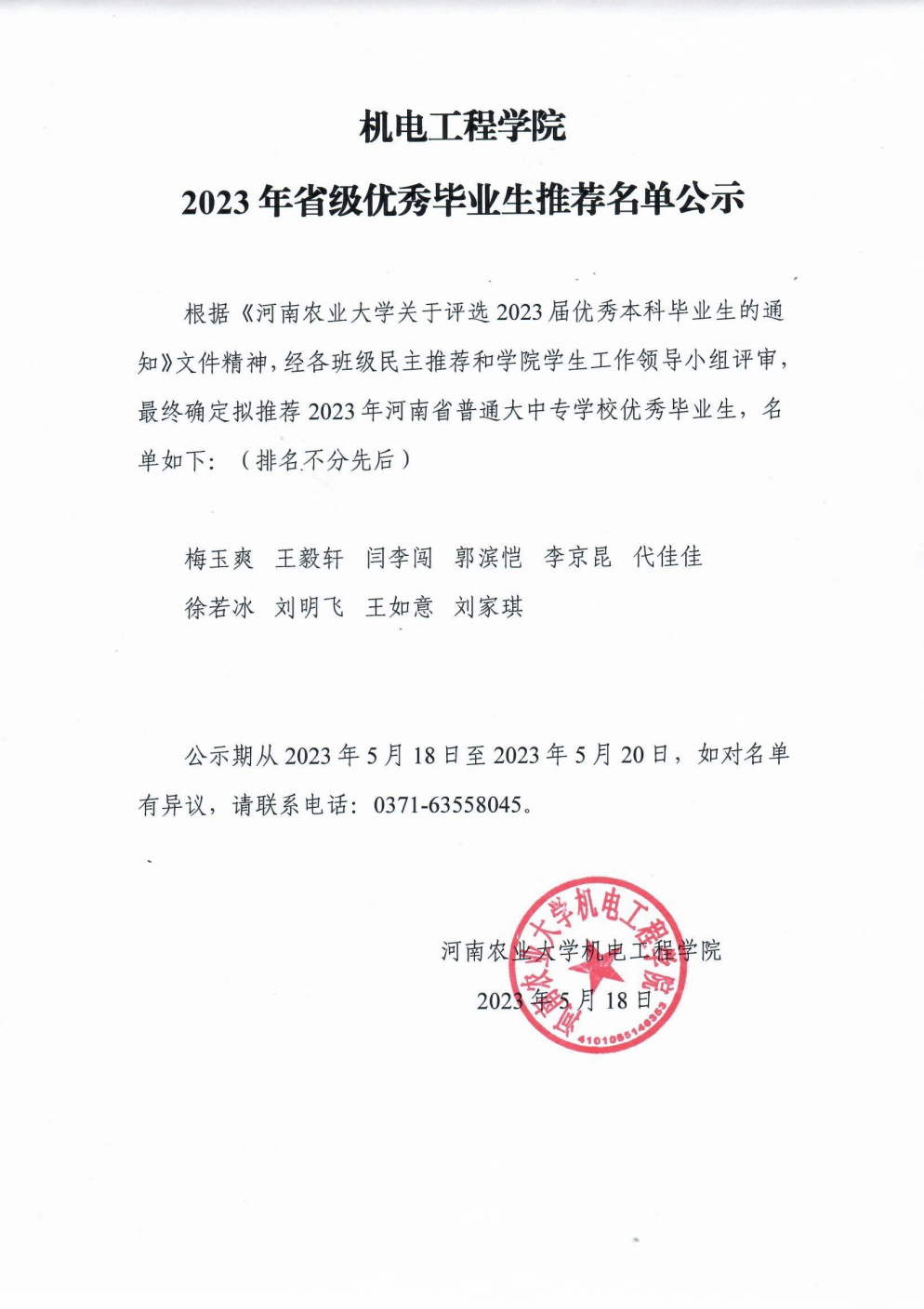 根据《成人影院 关于评选 2023 届优秀本科毕业生的通知》文件精神,经各班级民主推荐和学院学生工作领导小组评审最终确定拟推荐 2023 年河南省普通大中专学校优秀毕业生,名单如下:(排名不分先后 )