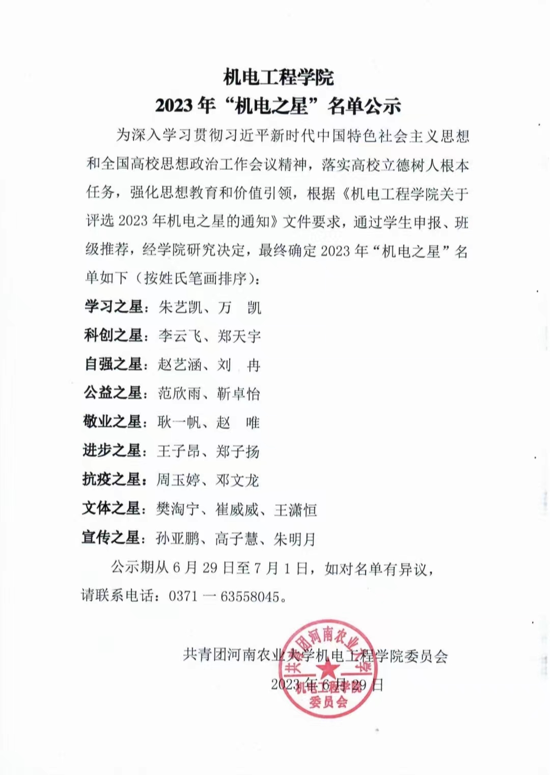 为深入学习贯彻习近平新时代中国特色社会主义思想和全国高校思想政治工作会议精神,落实高校立德树人根本任务,强化思想教育和价值引领,根据《成人影院 关于评选2023年机电之星的通知》文件要求,通过学生申报、班级推荐,经学院研究决定,最终确定2023年“机电之星”名单如下(按姓氏笔画排序):