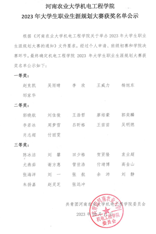 根据《成人影院 成人影院 关于举办2023年大学生职业生涯规划大赛的通知》文件要求,经过个人申请、班级初赛和学院决赛环节,最终确定成人影院 2023年大学生职业生涯规划大赛获奖名单公示如下: