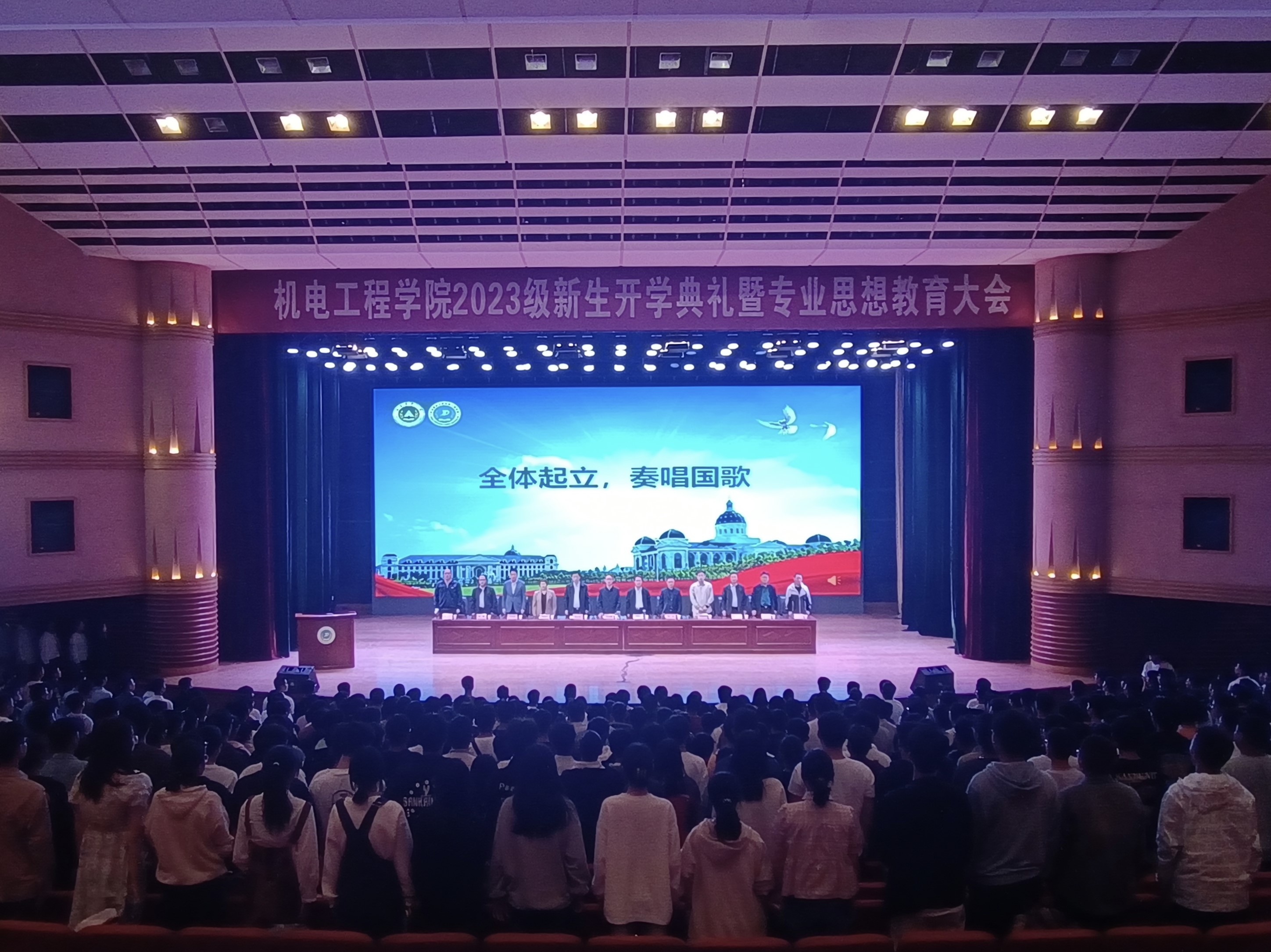 会议伊始,全体起立,在庄严肃穆的氛围中奏唱中华人民共和国国歌。伴随着激昂的国歌,2023级新生开学典礼正式拉开帷幕。