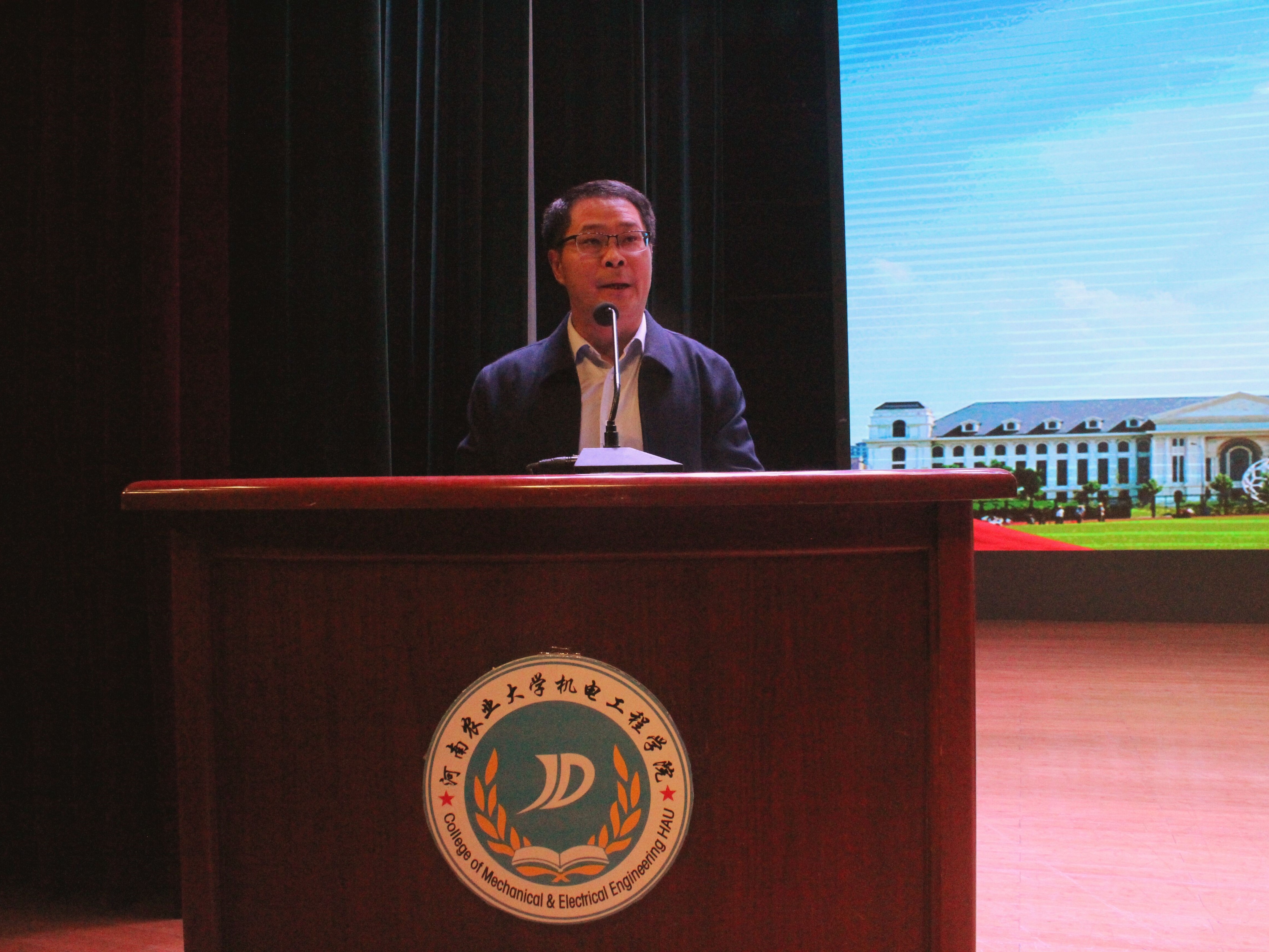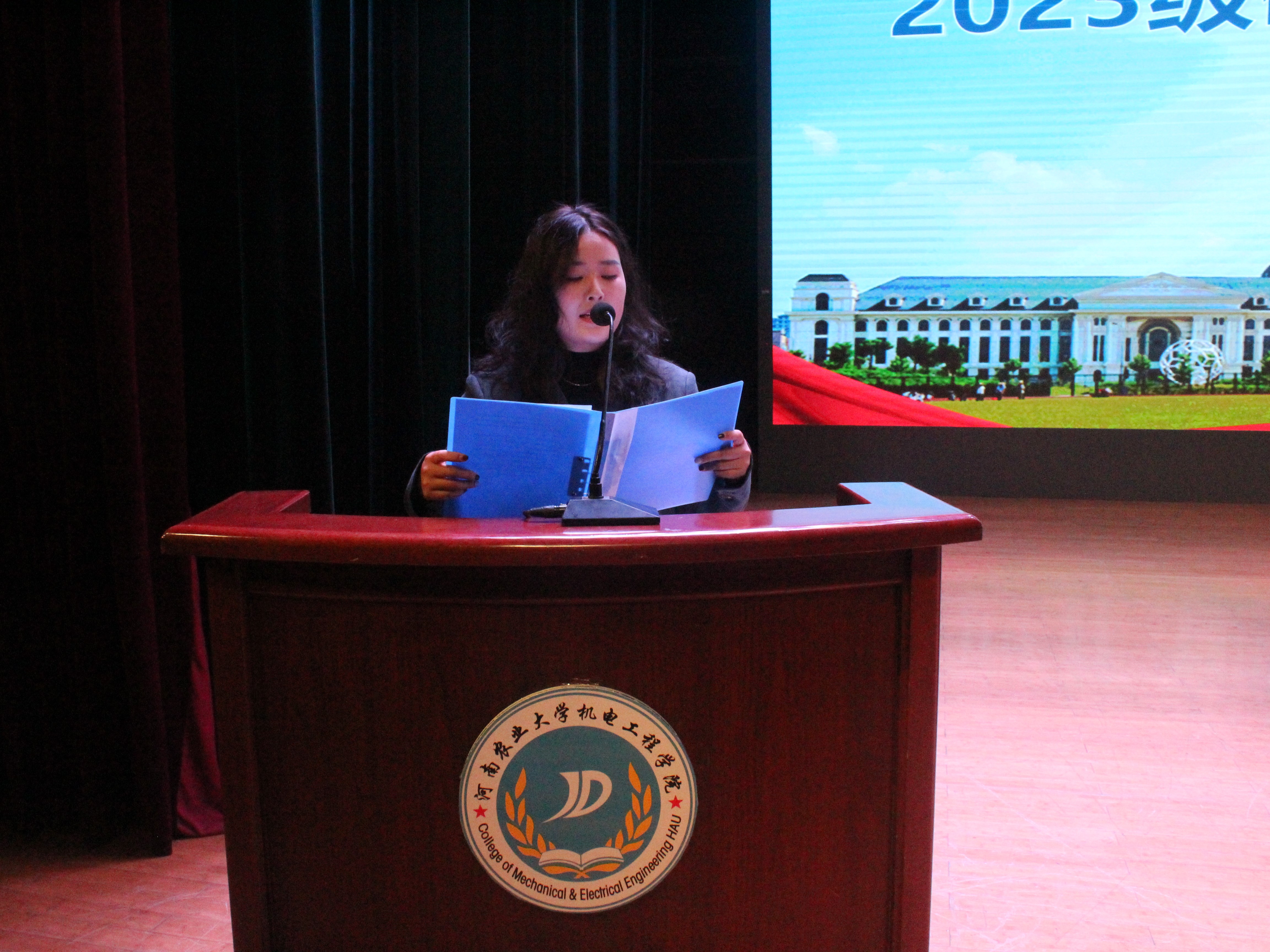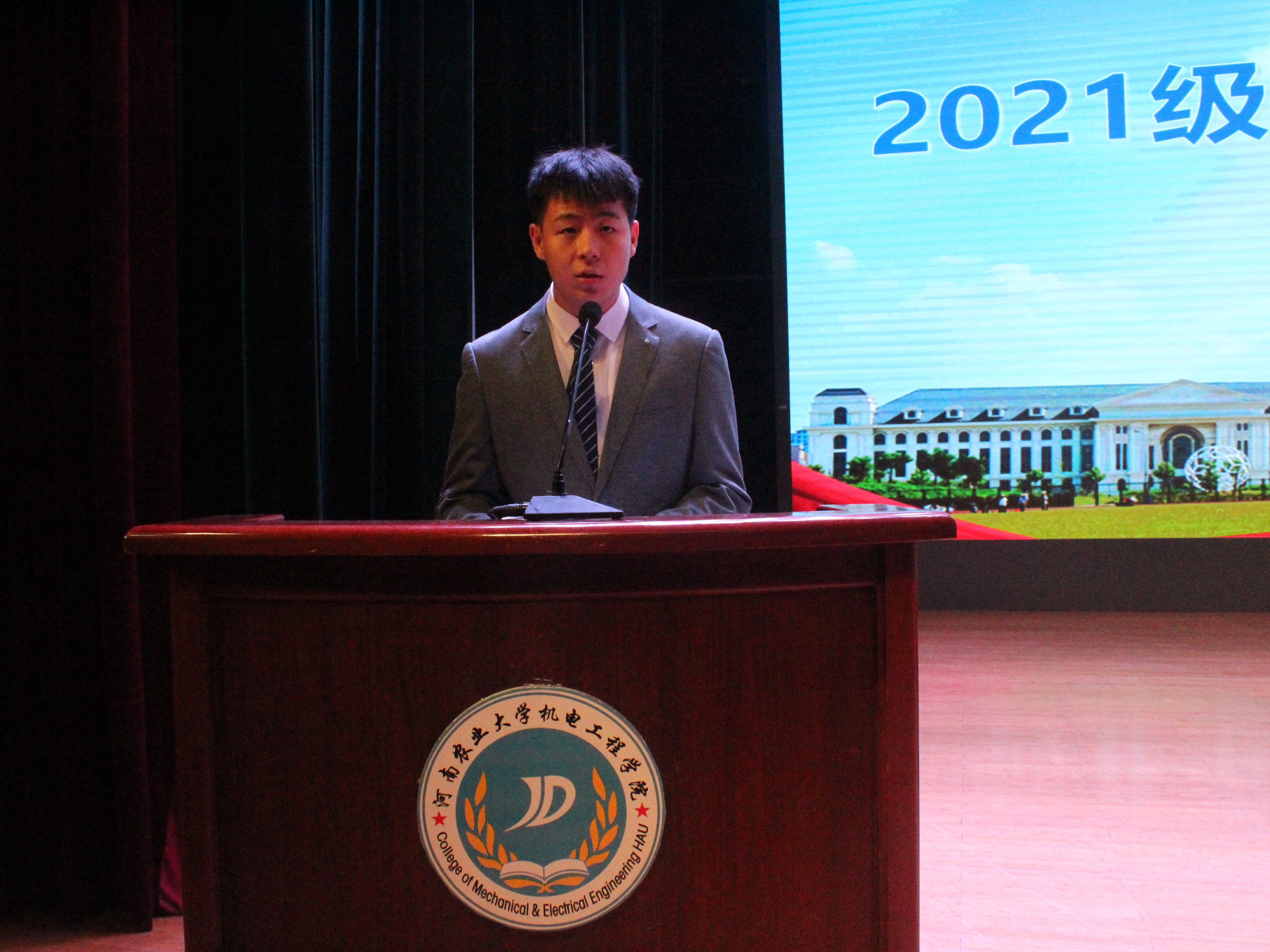 胡建军进行致辞,他首先对全体新生表示热烈欢迎并致以诚挚的问候。紧接着,他围绕学院发展历程、师资力量、办学理念及荣誉成就等方面介绍学院基本情况。并对新生  提出三点希望:坚定理想信念,锚定青春航向,用实际行动实践报国之行;练就过硬本领,汲取奋进力量,担当起时代赋予的重大使命;投身伟大实践,担当时代重任,在青春时代拼搏奋进,为未来赋能。最后他祝愿全体同学能在大学时代发现自我,释放潜能,以机电学院为起点,乘风破浪,勇创辉煌,向着未来不断前进。
