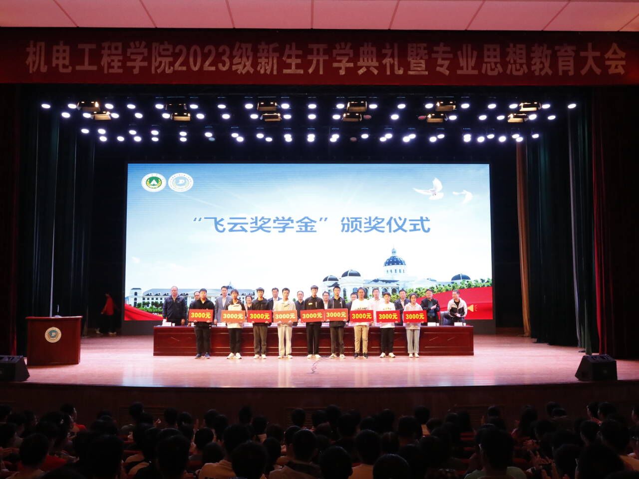 刘淑杰、王振锋分别宣读《成人影院 关于颁发2023级新生“飞云奖学金”的决定》及《成人影院 关于选聘2023级本科生新生专业辅导员及学生助理班主任的决定》,与会领导老师为获奖新生颁奖。