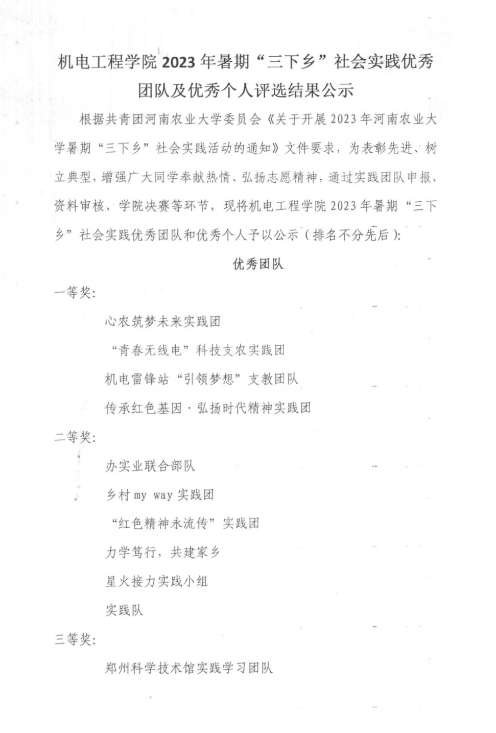 根据共青团成人影院 委员会《关于开展2023年成人影院 暑期“三下乡”社会实践活动的通知》文件要求,为表彰先进、树立典型,增强广大同学奉献热情、弘扬志愿精神,通过实践团队申报、资料审核、学院决赛等环节,现将成人影院 2023年暑期“三下乡”社会实践优秀团队和优秀个人予以公示(排名不分先后):