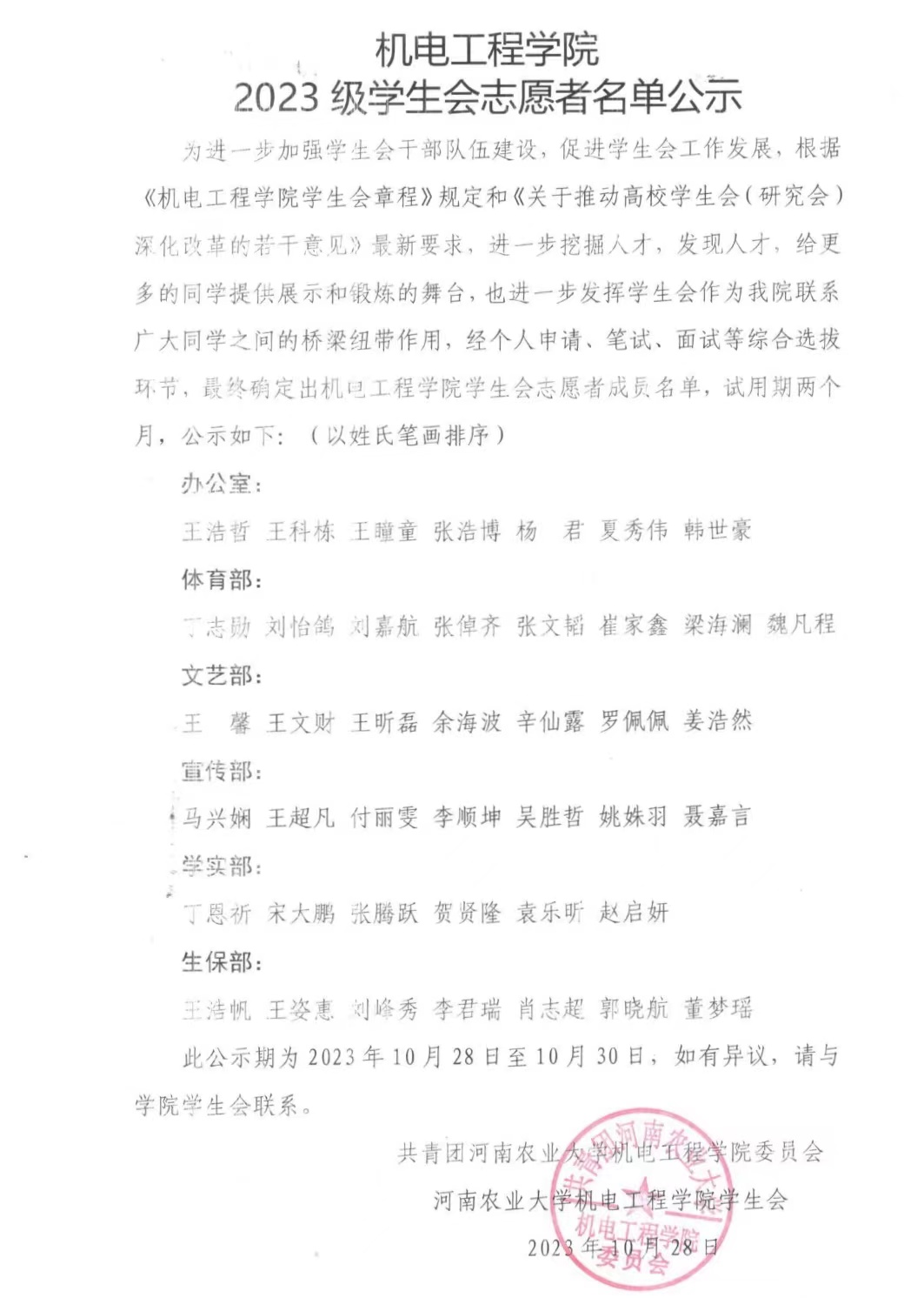 成人影院 2023 级学生会志愿者名单公示